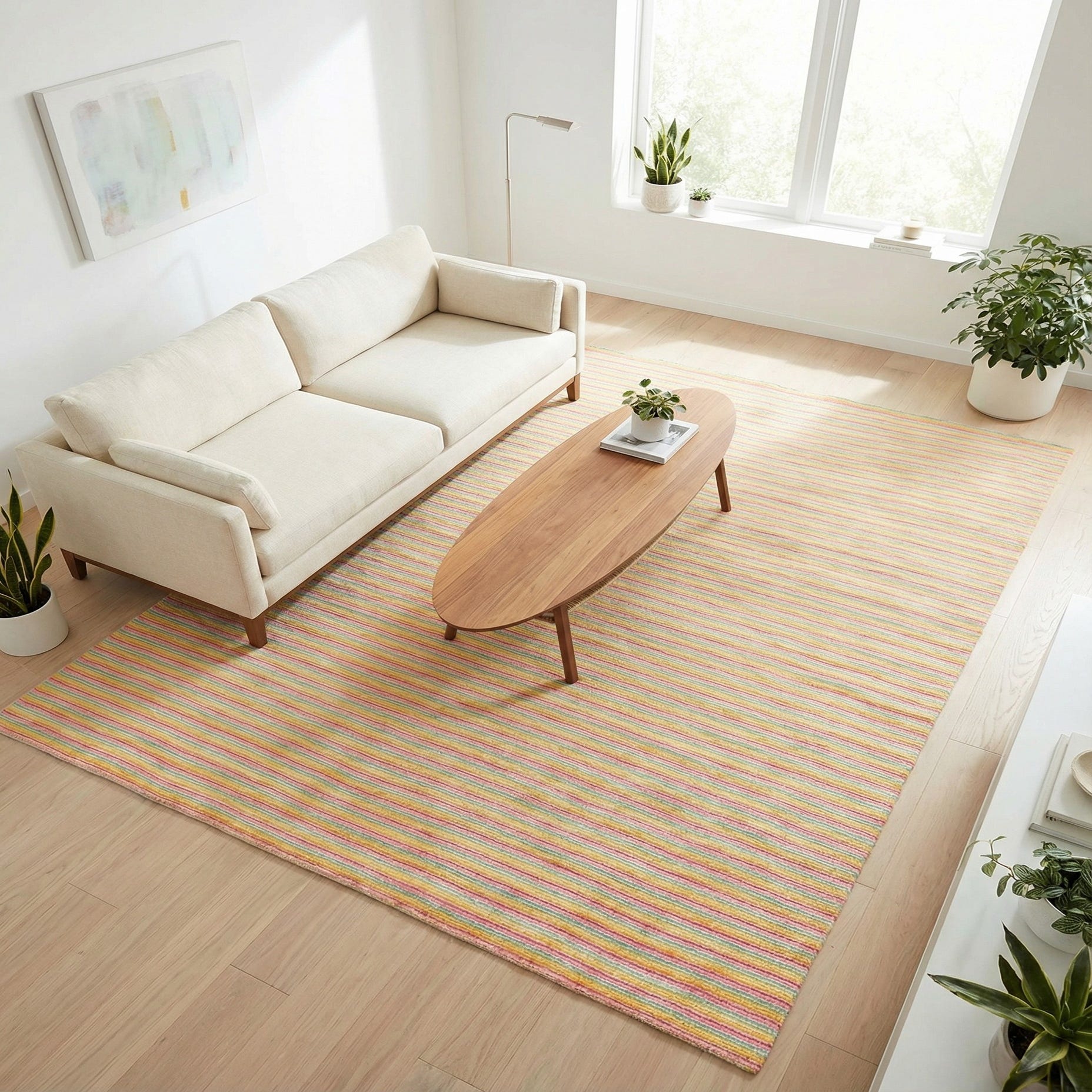 A rectangular 8x10 multi-colored modern stripe wool rug with thin horizontal lines in various bright hues.