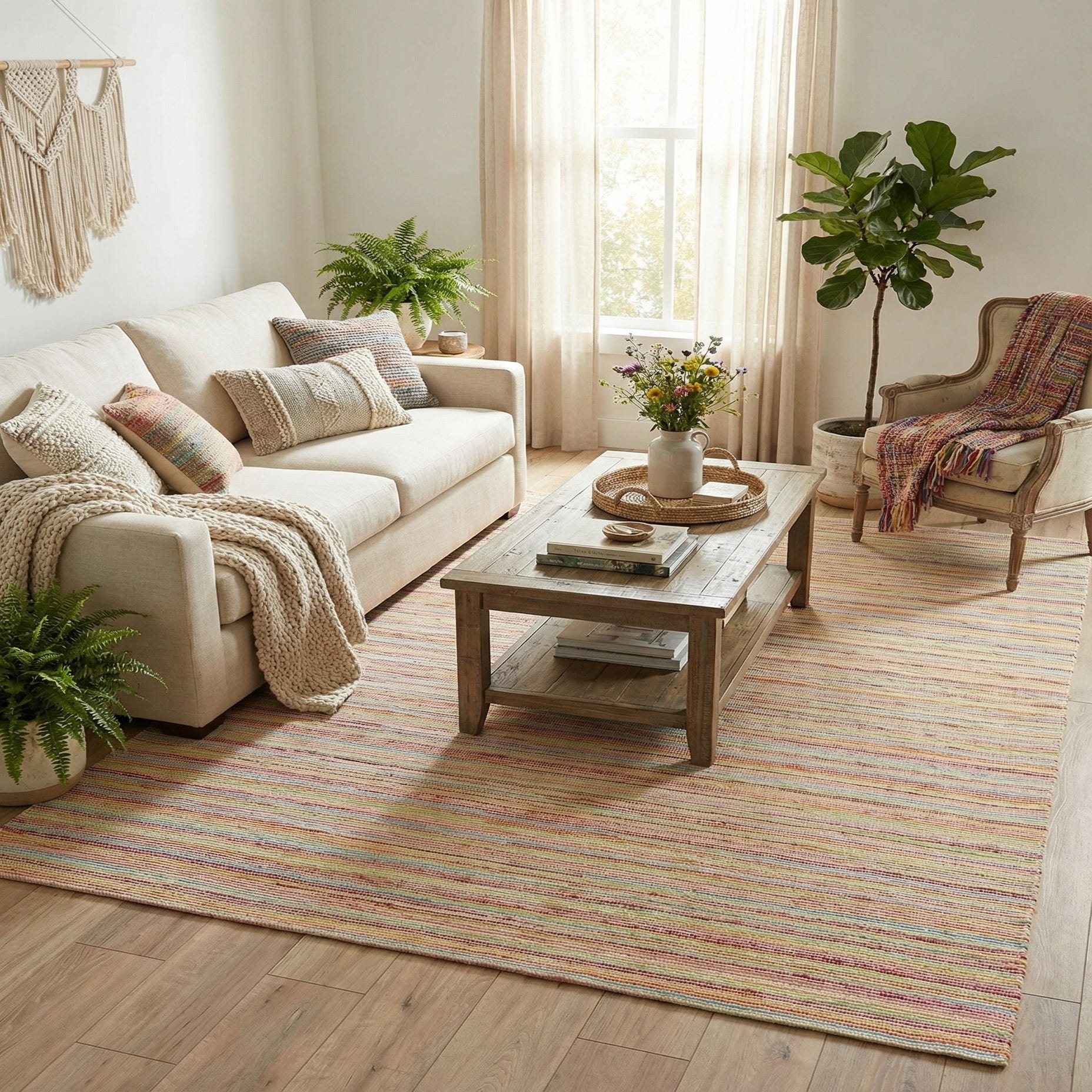 A rectangular 8x10 multi-colored striped area rug, handmade from jute, wool, and cotton, suitable for a living room.