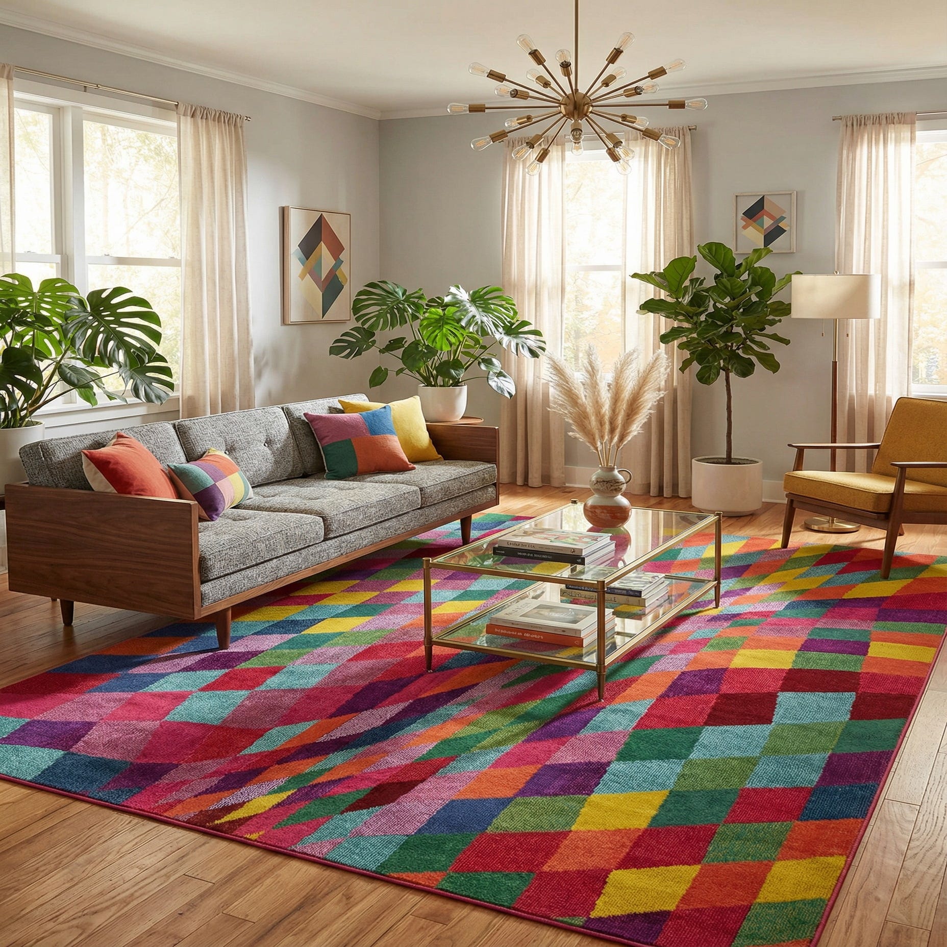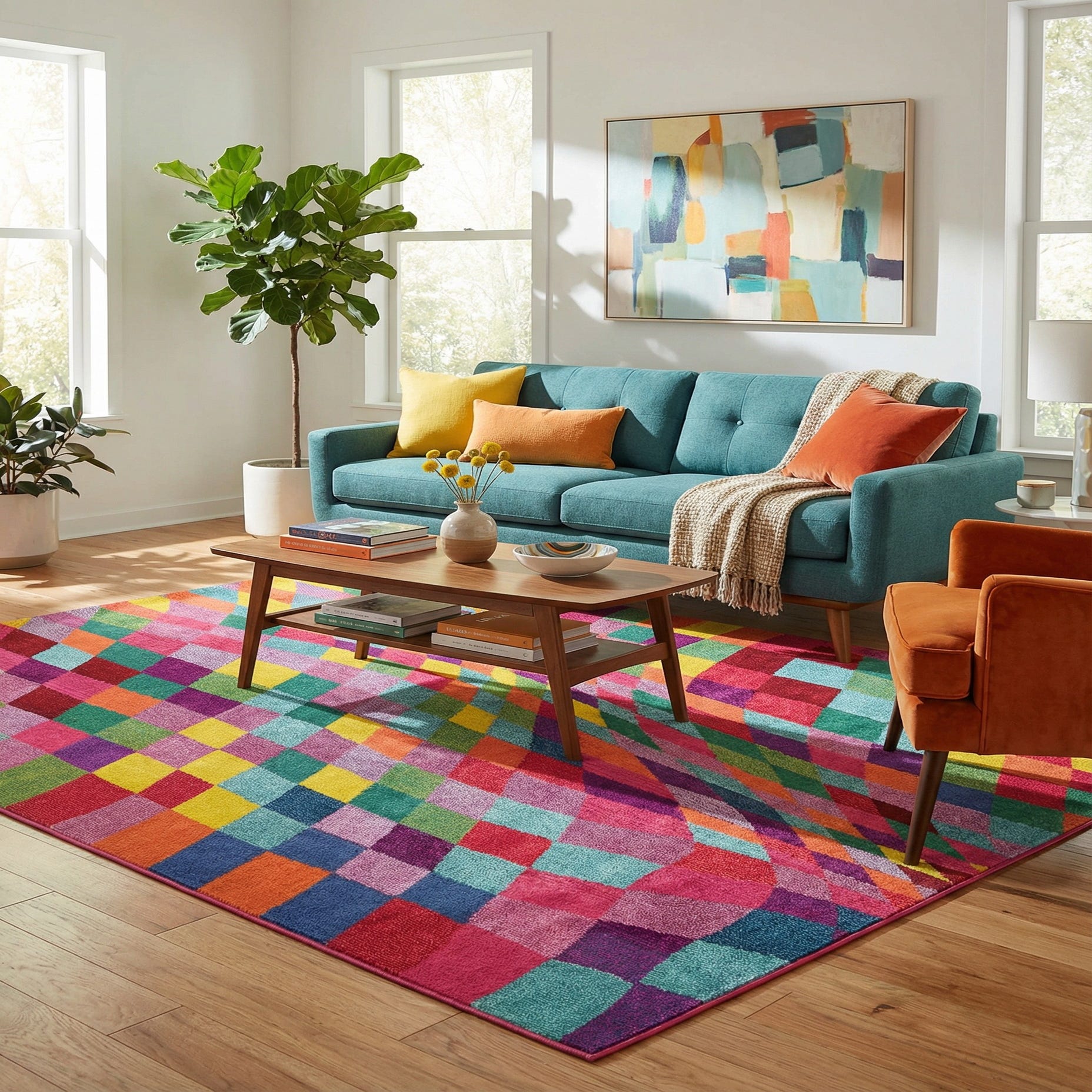 Place this rug beneath a neutral linen sofa to anchor a contemporary living room, use it to bring energy to a home office, or set it in a dining area with simple wood or metal seating to balance the vibrant pattern. It pairs well with mid-century and eclectic decor alike; complement the colors with solid textiles in jewel tones, warm wood finishes, and metal accents in brass or matte black for a cohesive look.