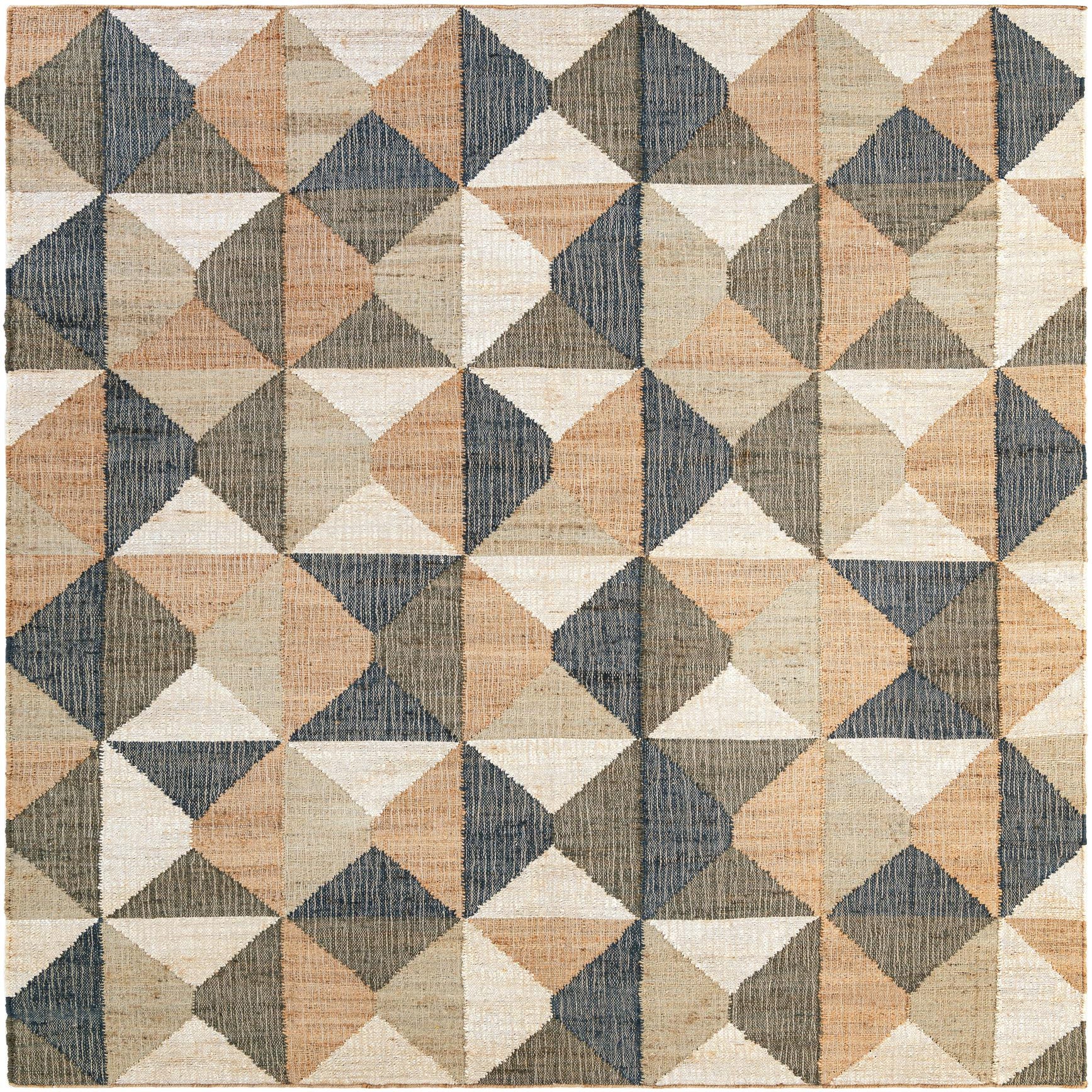 A rectangular 8x10 modern area rug featuring a geometric pattern in multi-colored jute and cotton.