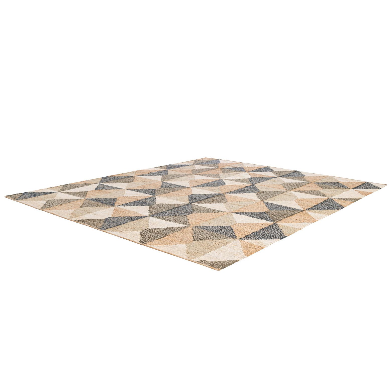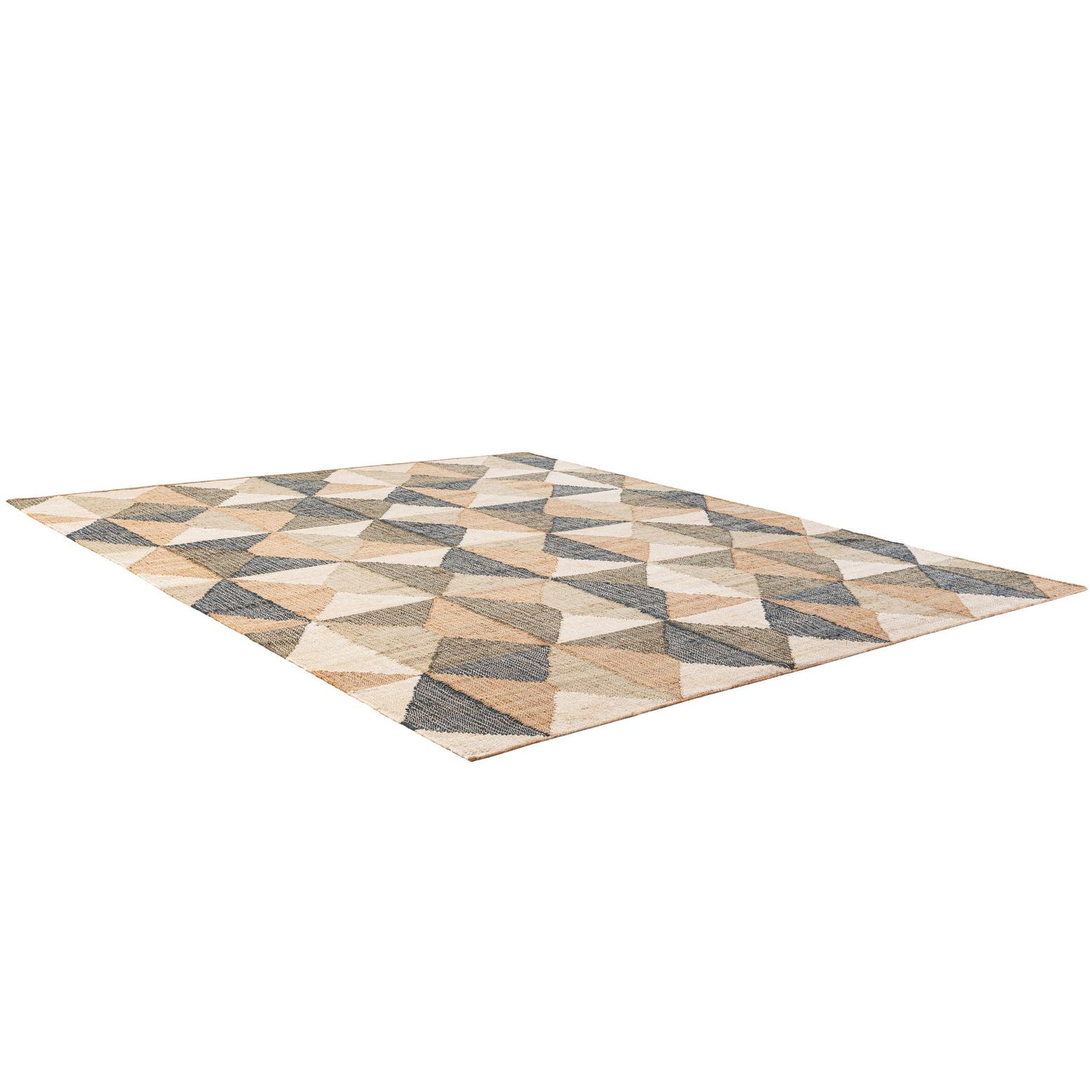 A rectangular 8x10 modern area rug featuring a geometric pattern in multi-colored jute and cotton.