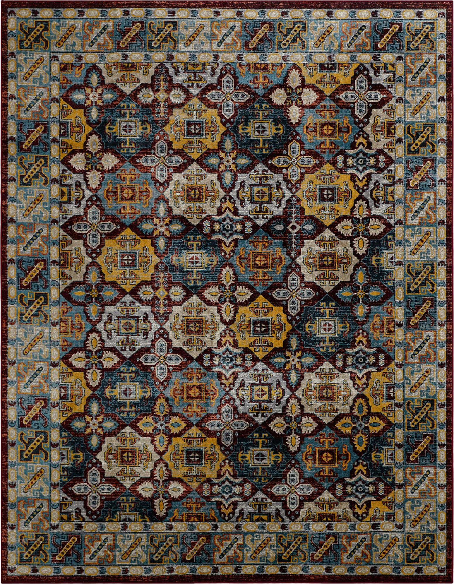 Primary color is Multi. Colors in this rug include: Multi, Black, Blue, Gray, Ivory, Red, Yellow.
