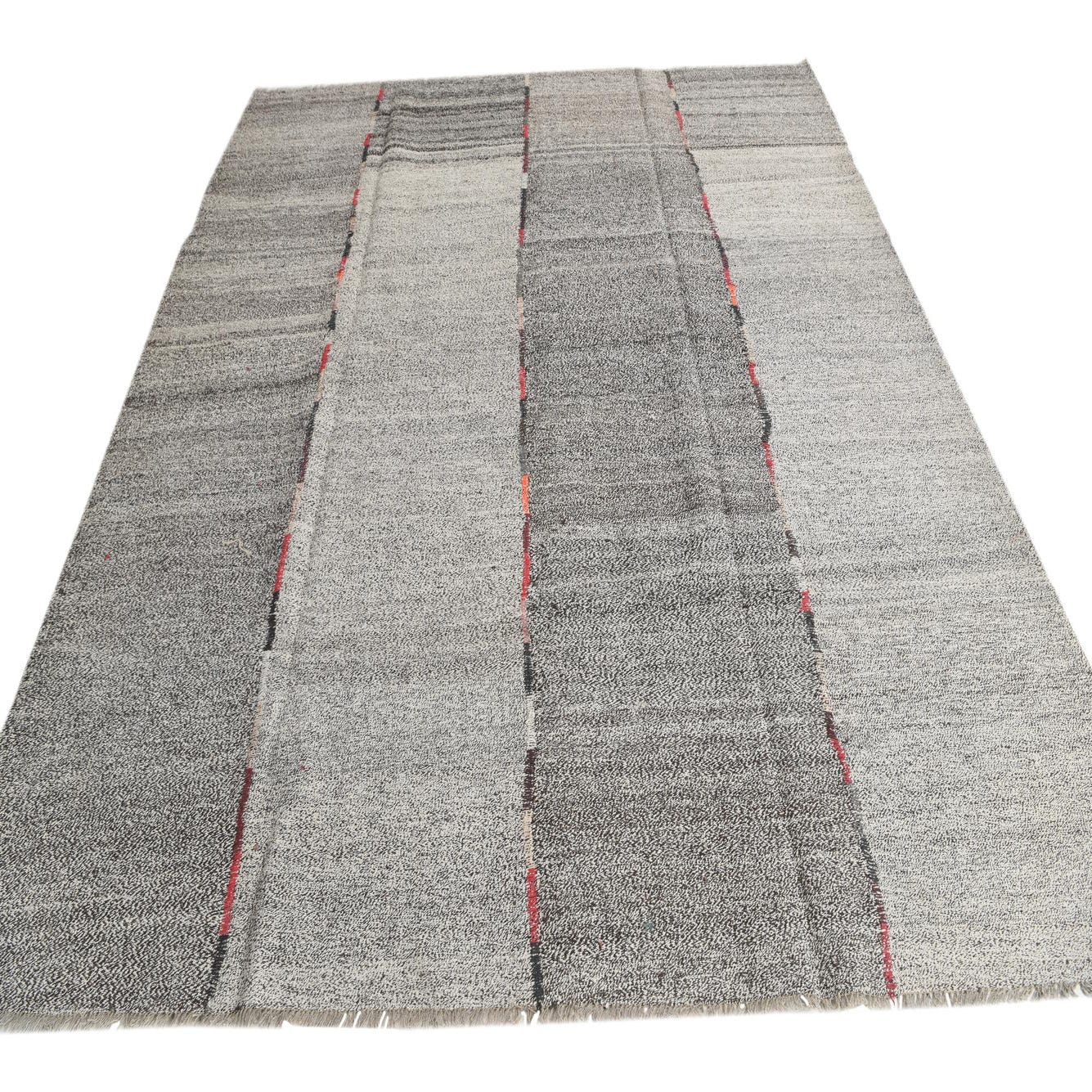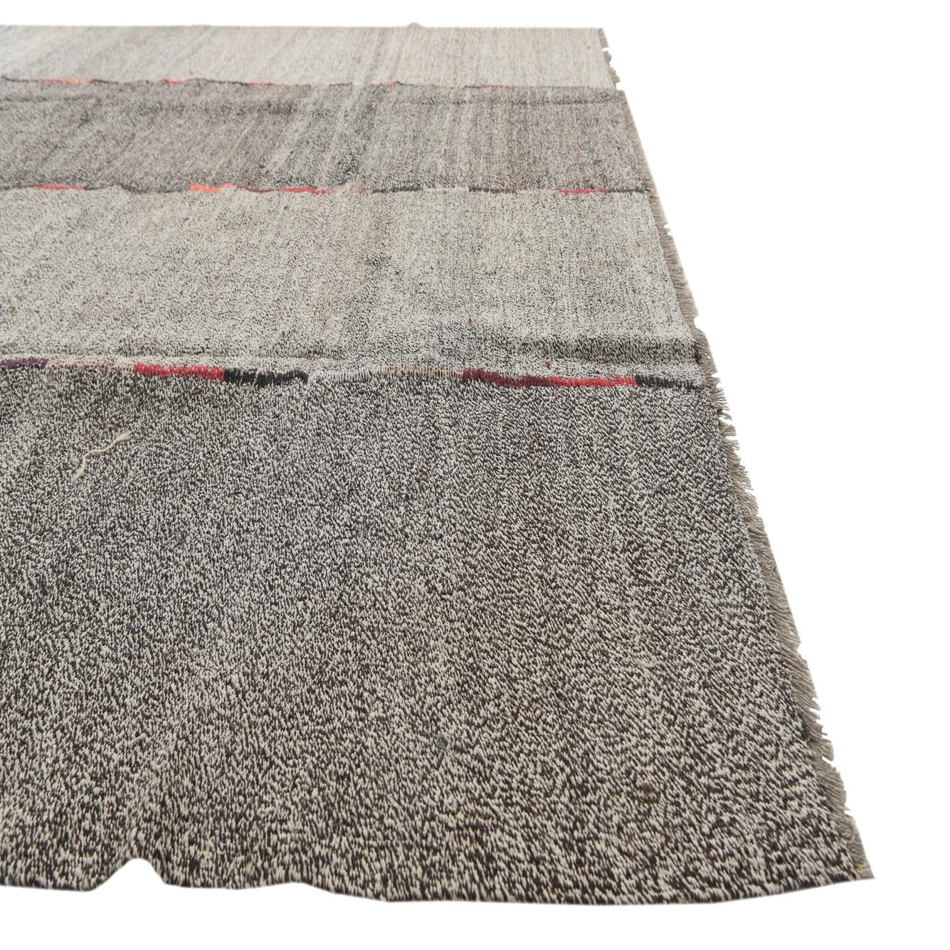 A rectangular 8x10 Kilim Modern wool rug featuring multi-colored tribal stripes in varying shades of gray, black, and red.