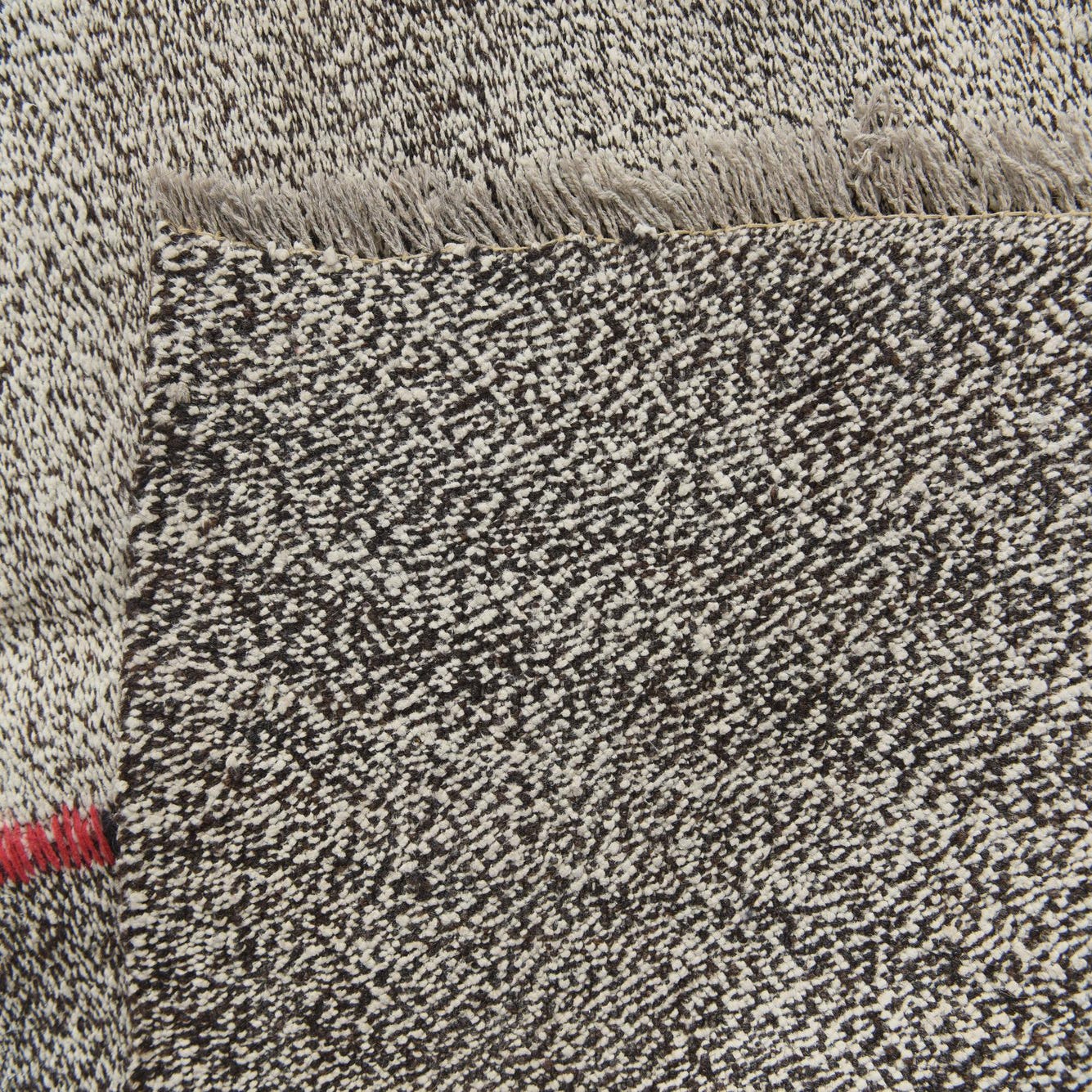The Kilim Modern collection presents a hand-woven 8x10 rug crafted from 100% wool, offering a robust texture with a comfortable underfoot feel. This piece displays a harmonious blend of colors, including a multi-tonal background interspersed with black, orange, red, and gray accents. The design features a contemporary take on the traditional Kilim patterns with a structured array of stripes and subtle geometric influences that bring visual interest without overwhelming the space.