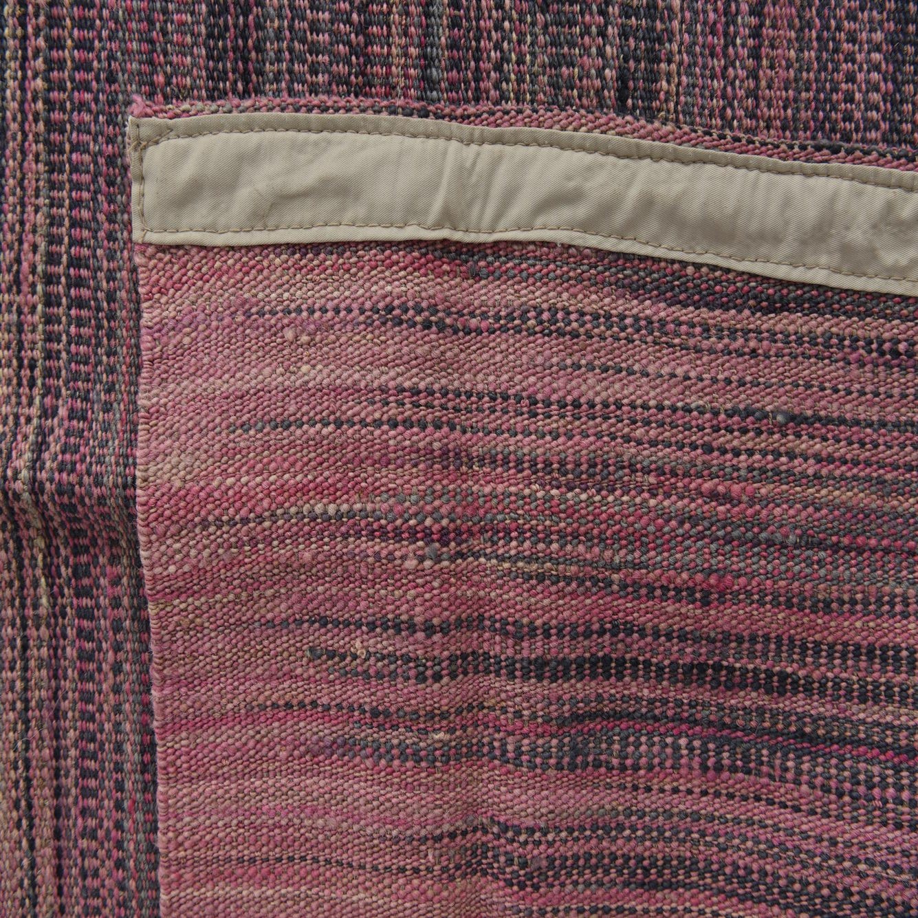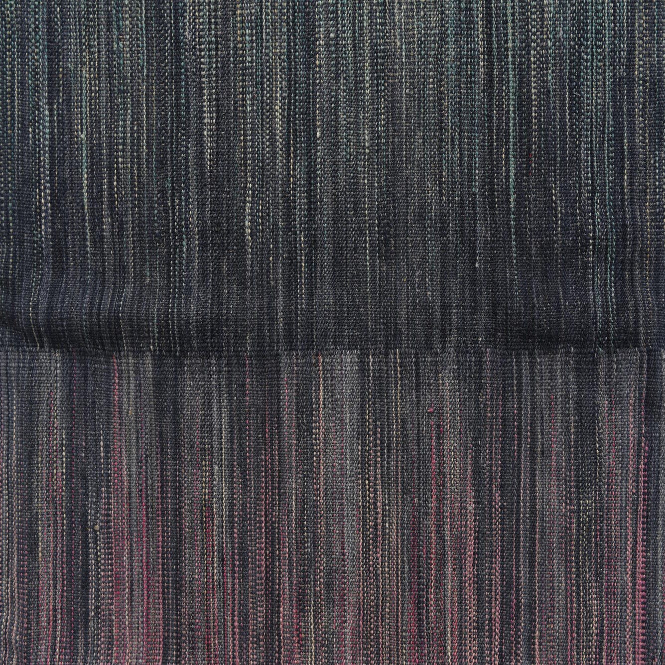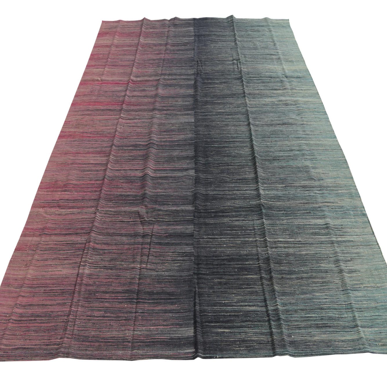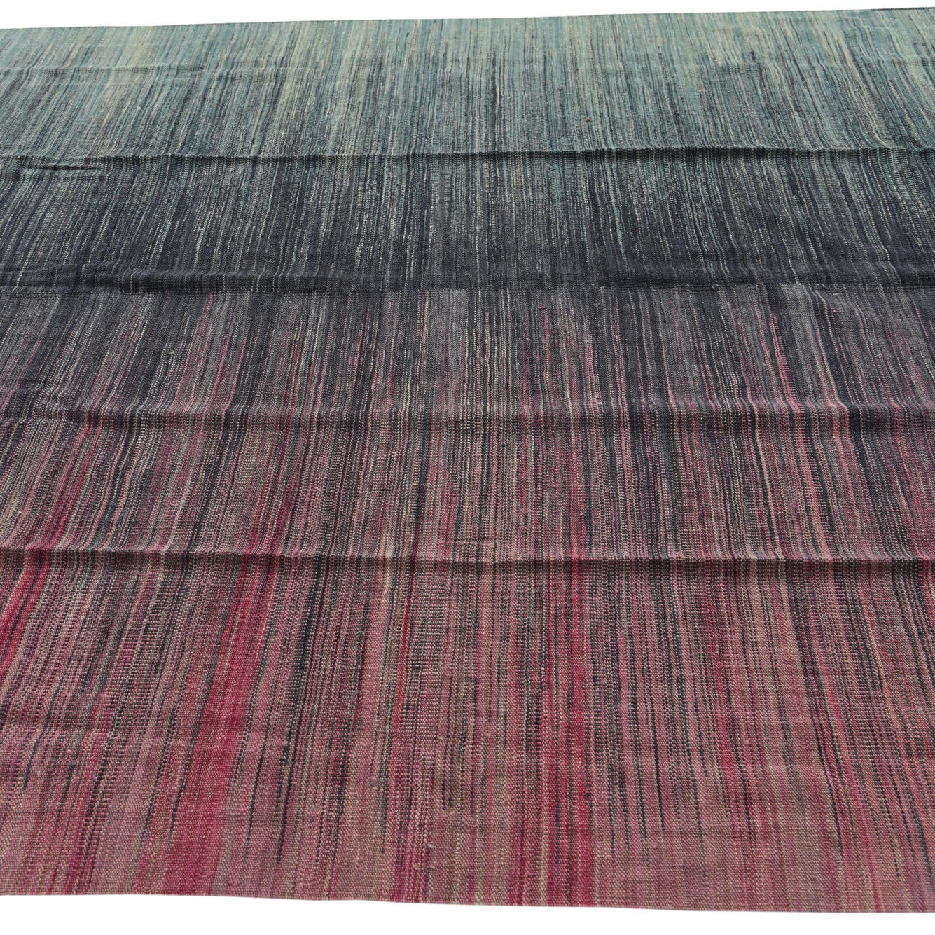 A flatwoven kilim with narrow, horizontal striations, this rug presents a soft ombré that moves from green tones at one edge through deep navy in the center to warm pink and beige at the other. The multi-colored background and subtle banding create a refined, low-contrast pattern rather than bold motifs, offering visual interest through color shifts and finely woven lines.