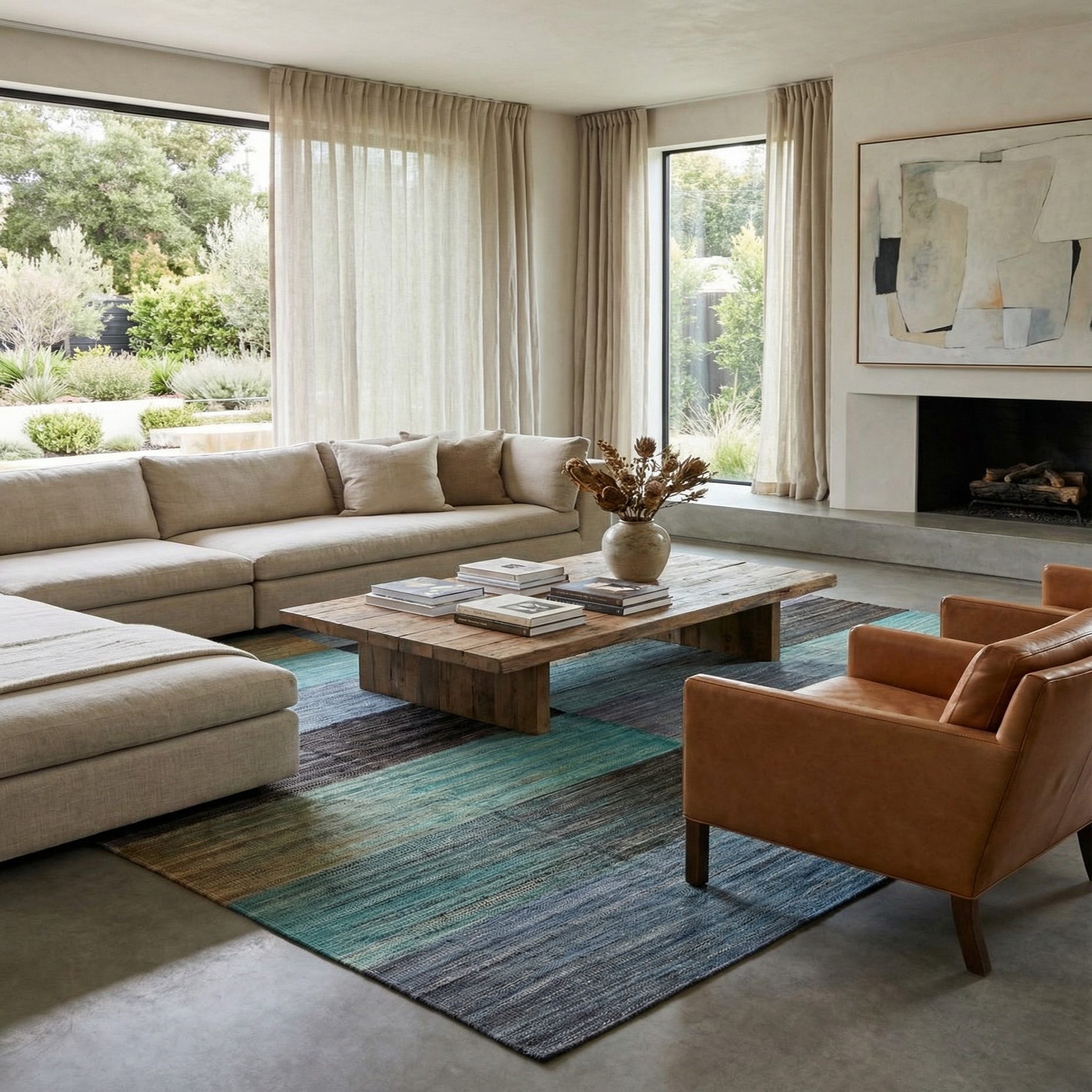 Hand woven of 100% wool, the rug has a low-profile, tactile surface that’s pleasant underfoot and shows the hand of the weaver in its slight variations and linear texture. The woven ribs give a subtle, textural rhythm across the pattern that works well in modern and transitional rooms. Use it to anchor a living room seating group, place it beneath a dining table for a contemporary casual dining setup, or layer it in a bedroom to introduce pattern without overwhelming the palette. It pairs particularly well with mid-century wood furniture, contemporary coastal schemes, and neutral, minimalist interiors that benefit from a measured pop of color and texture.