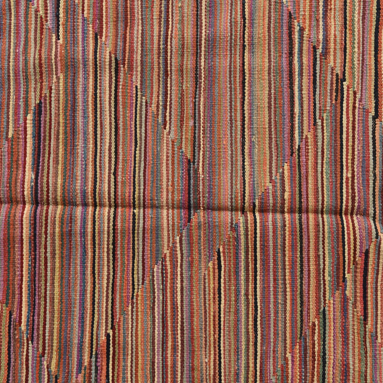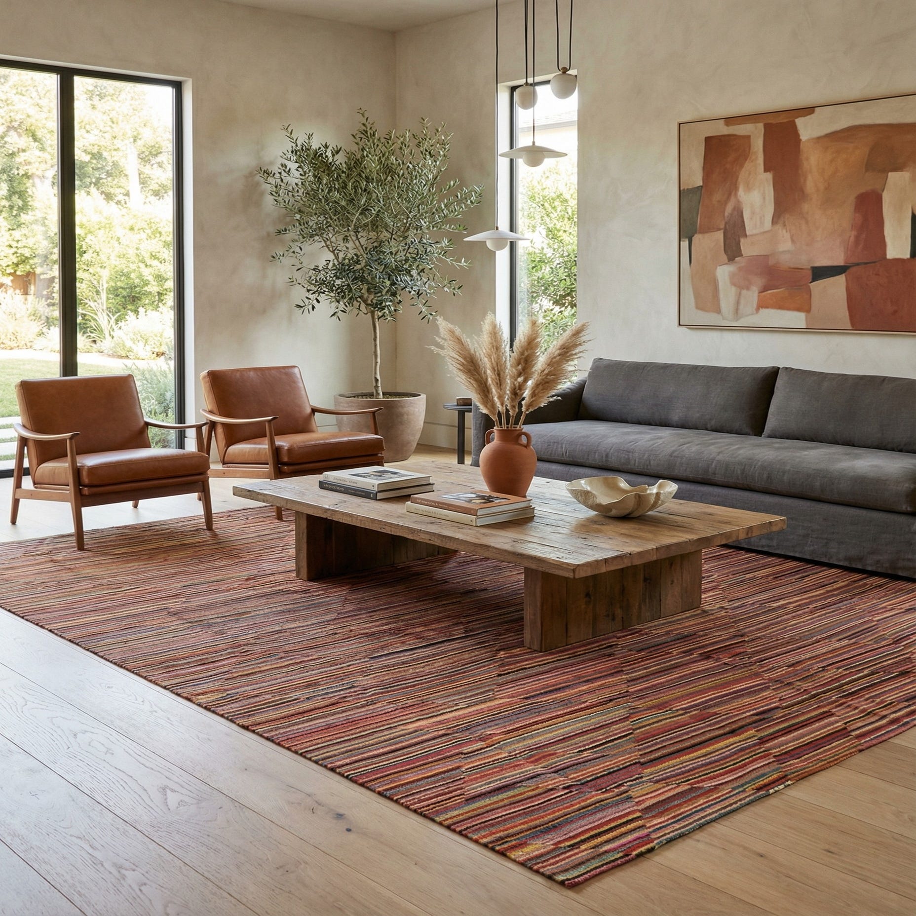 This rug suits a range of interiors: it pairs neatly with mid-century modern furniture where the linear pattern complements wood grain, anchors layered bohemian or global schemes with other textiles, and fits well under dining chairs or in a home office because the flat profile allows for easy chair movement. The multi-hued palette works with warm woods and neutral upholstery as well as with bolder accent colors when you want a collected, lived-in look.