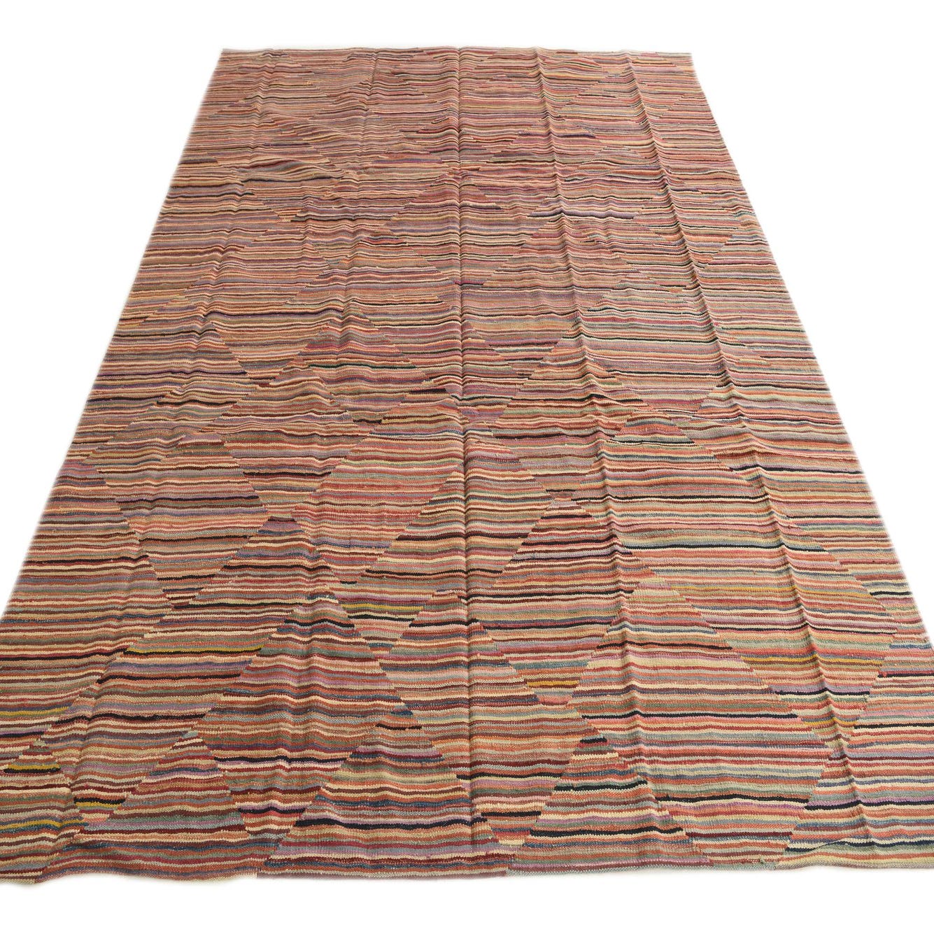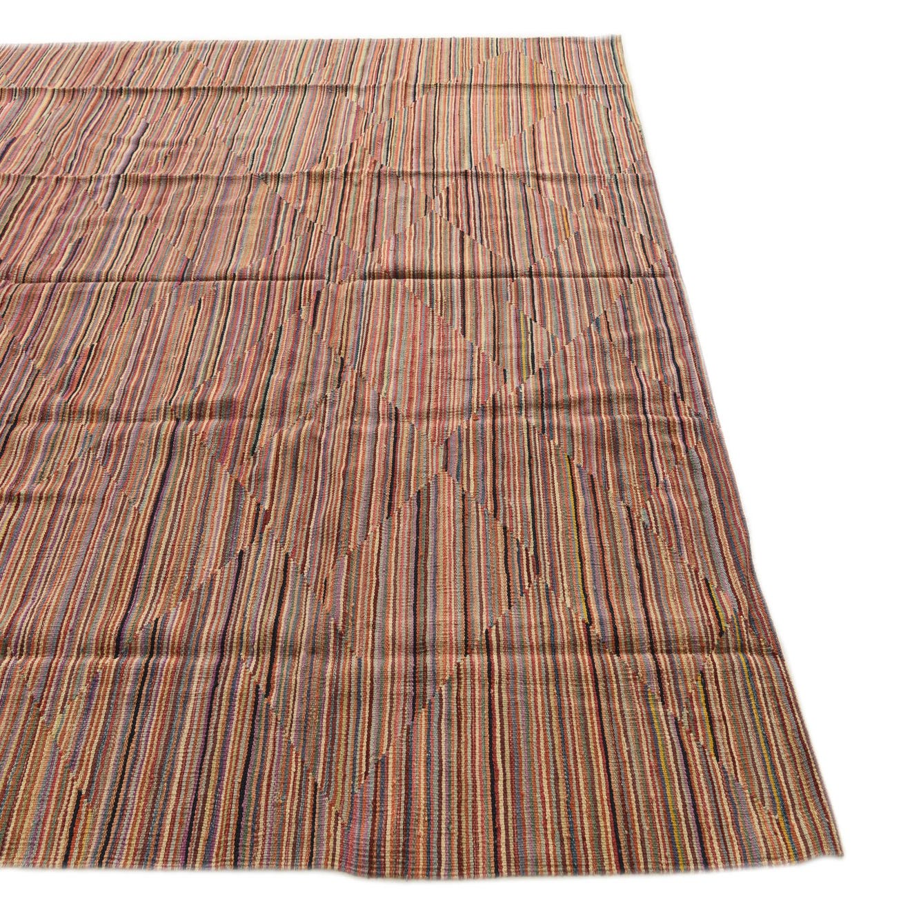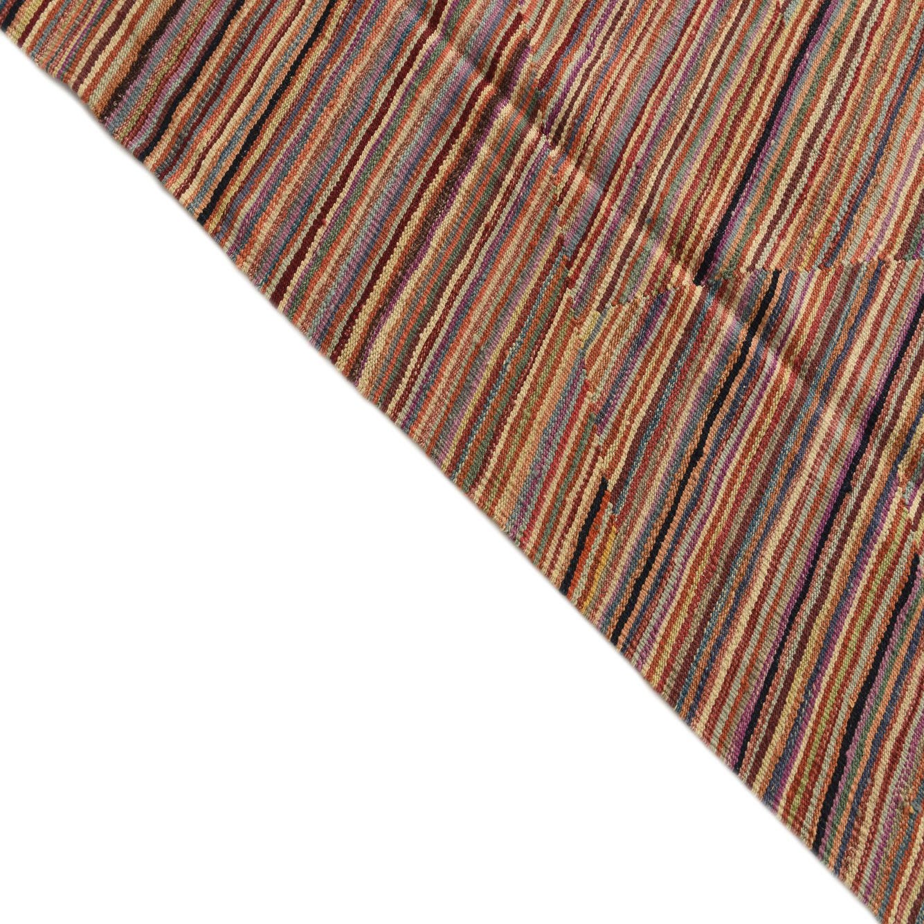 Hand-woven from 100% wool, this flatwoven kilim displays narrow horizontal stripes in a multi-colored background—beige, black, blue, brown, green, ivory, red, yellow, violet and pink—arranged into a subtle geometric layout of rotated squares and diamonds. The stripe directions shift within each shape to create a checkerboard-like field that reads lively yet structured. The surface is low-pile and tightly woven; the wool has a firm, slightly ribbed hand that feels textured underfoot and lays flat in a room.