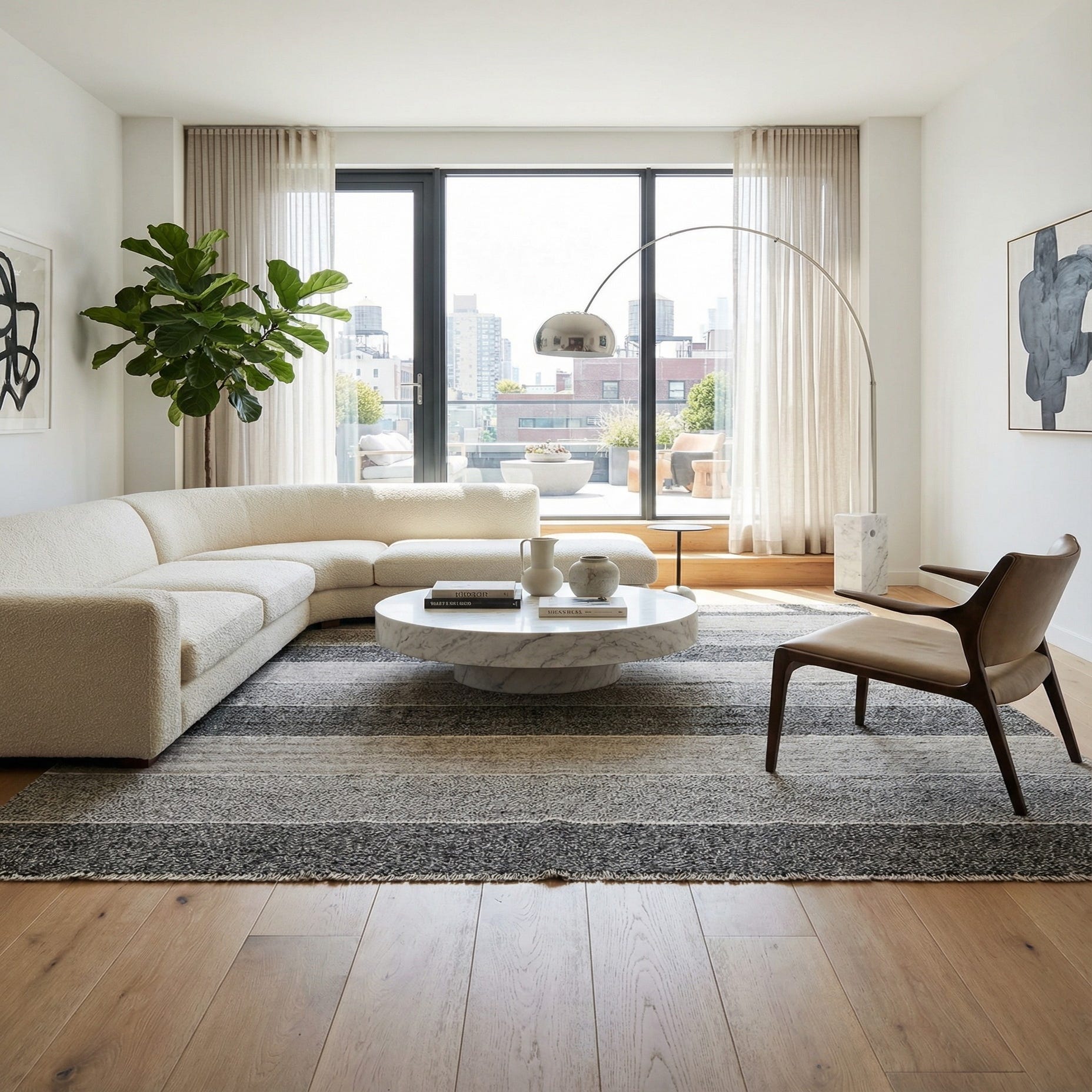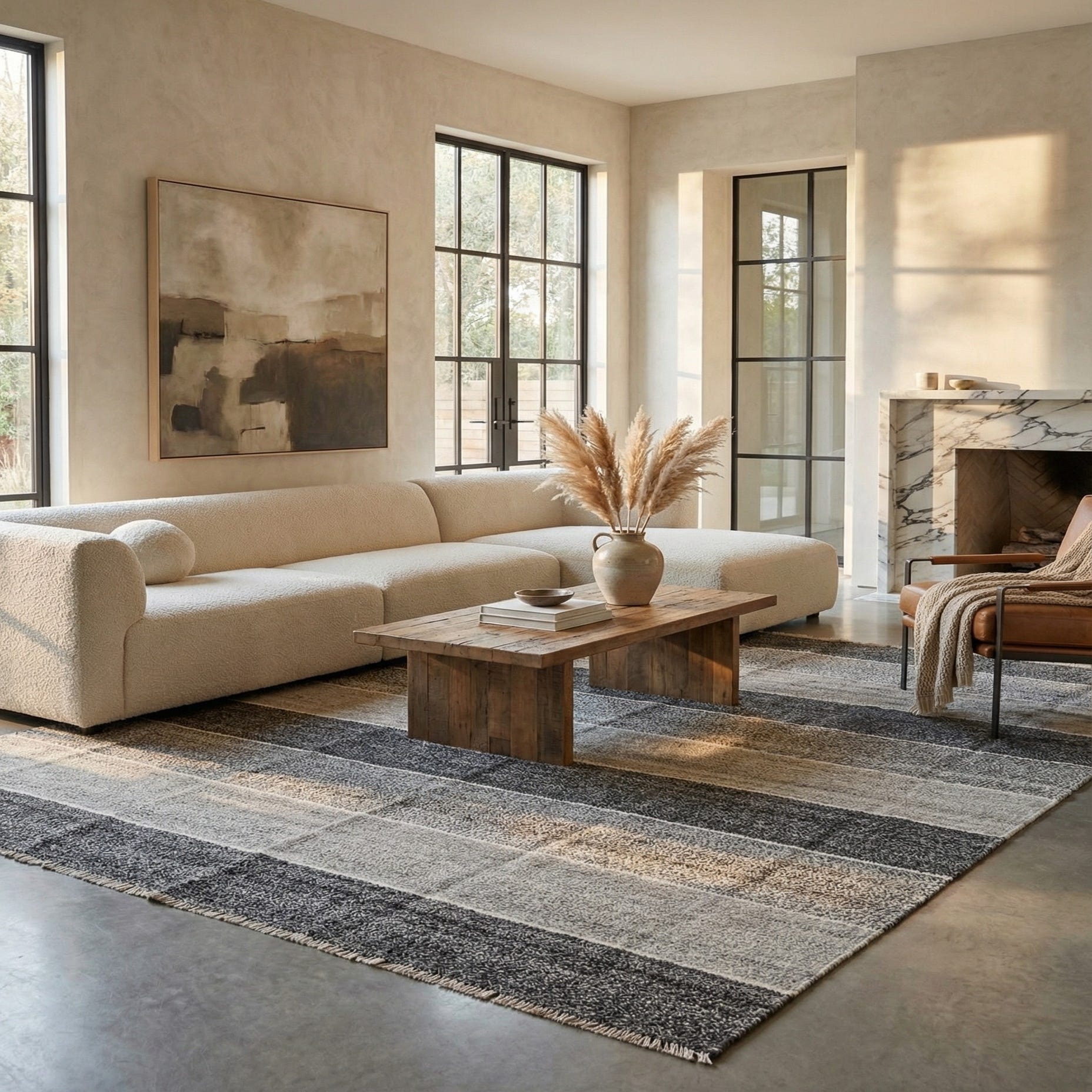 The pattern is a series of horizontal bands that create a sense of order and calm in the space it inhabits. Edged with fringe, the rug adds an additional element of craftsmanship and texture to its appearance. This versatile piece is well-suited to a variety of interior design scenarios, from modern minimalist spaces where it can serve as a grounding element, to more eclectic settings where its pattern and neutral colors will harmonize with a range of decorative styles. In either scenario, the Kilim Modern rug is a sophisticated choice that brings both visual appeal and artisanal quality to the environment.
