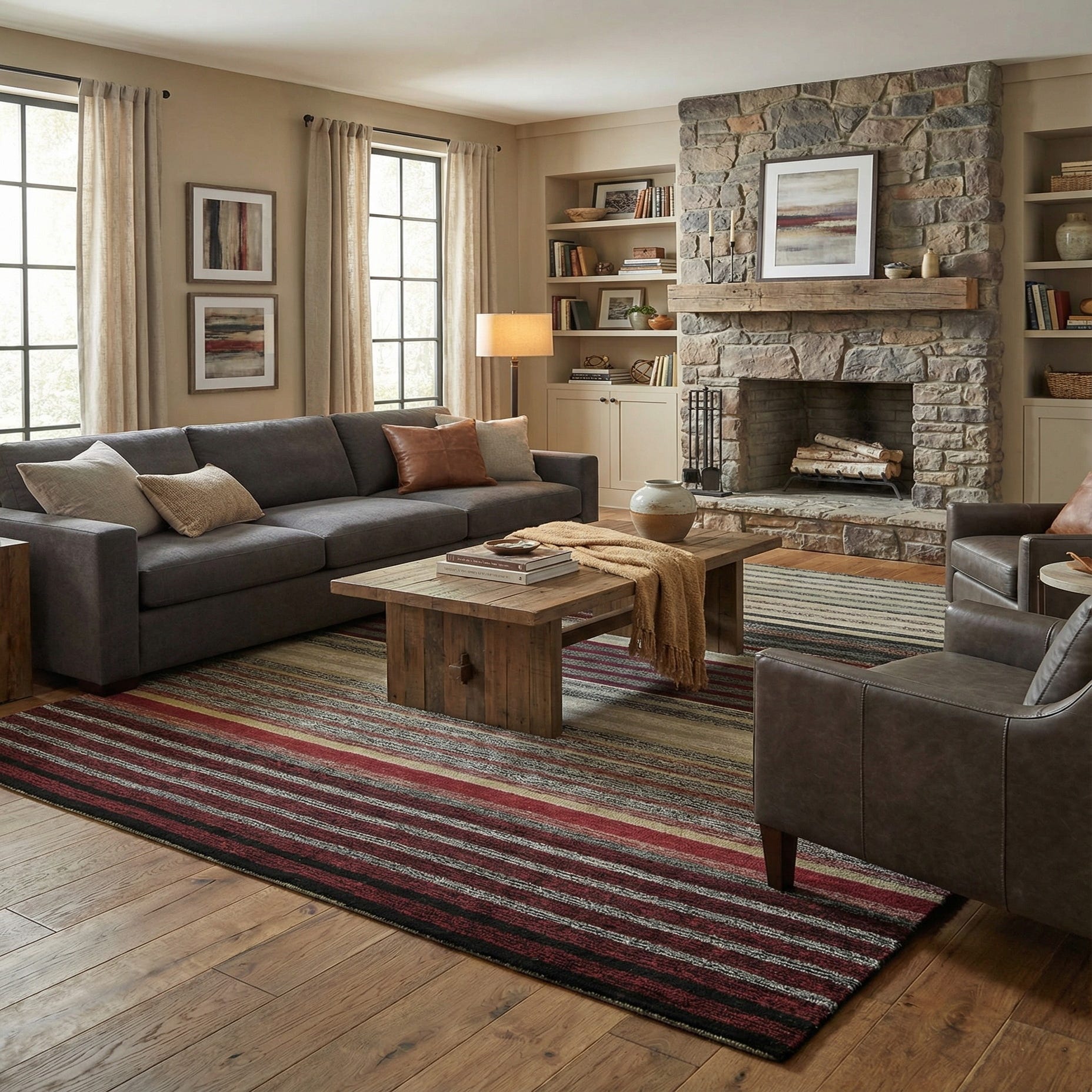 A rectangular 8x10 multi-colored modern stripe area rug made of wool and cotton, featuring varying horizontal bands of red, gray, beige, and black.