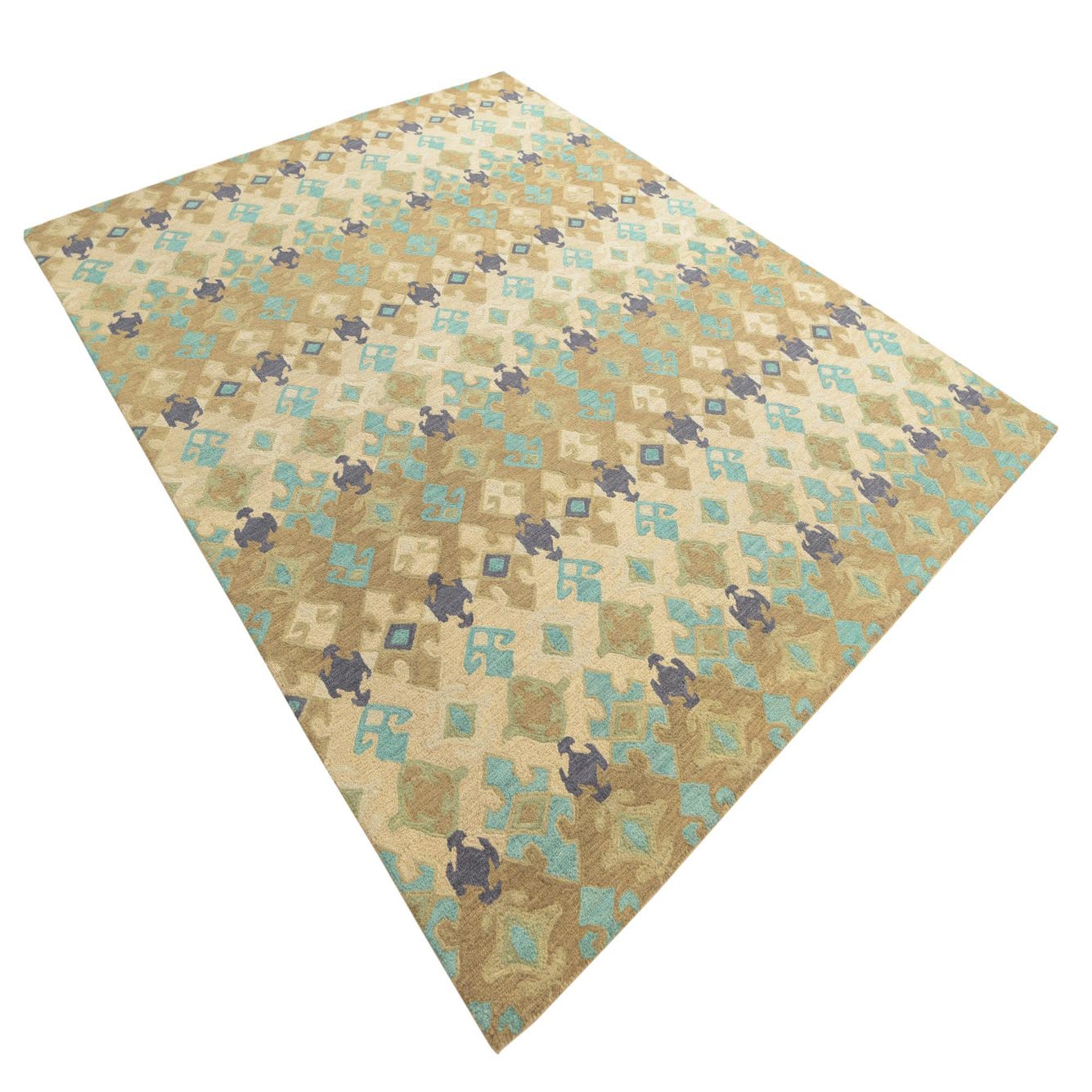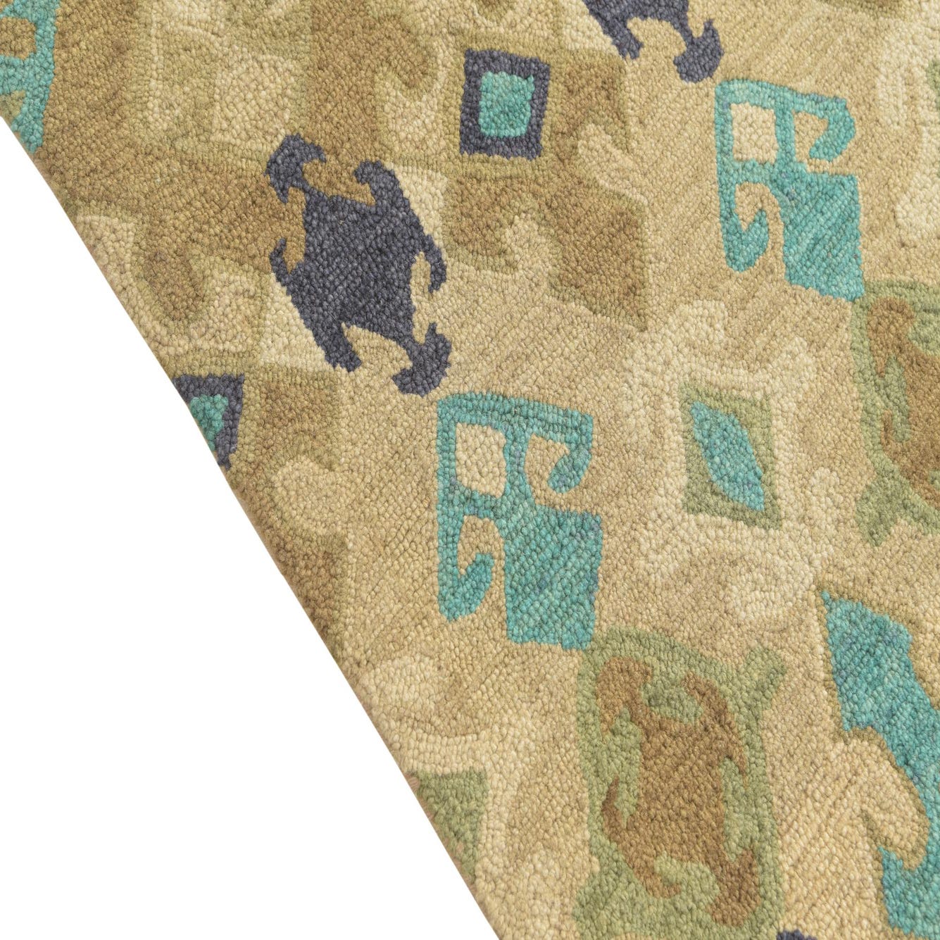 With its distinctive design, this rug can serve as a focal point in a variety of interior settings. Its earthy beige and brown tones, combined with pops of navy blue and teal, allow it to complement both neutral and more vibrant color schemes. It would integrate seamlessly into a contemporary living room, a modern bohemian space, or an eclectic office, adding visual depth to the room's aesthetics.