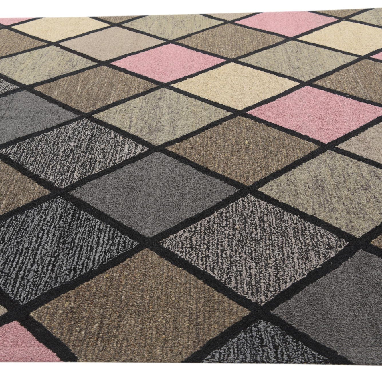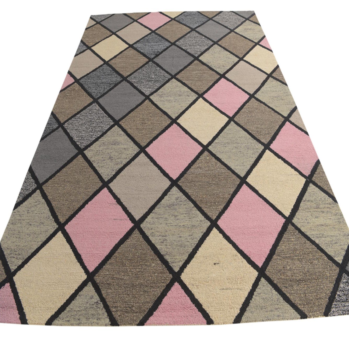 The Luna Collection presents a hand-tufted 8x10 rug that blends wool and cotton materials to achieve a durable yet soft texture. Its pattern features an array of diamonds in a harmonious balance of beige, black, brown, gray, and pink hues set against a multi-colored background. This contemporary design yields a playful yet sophisticated look, making it a versatile piece for an array of interior settings.