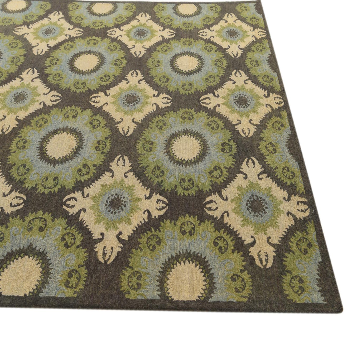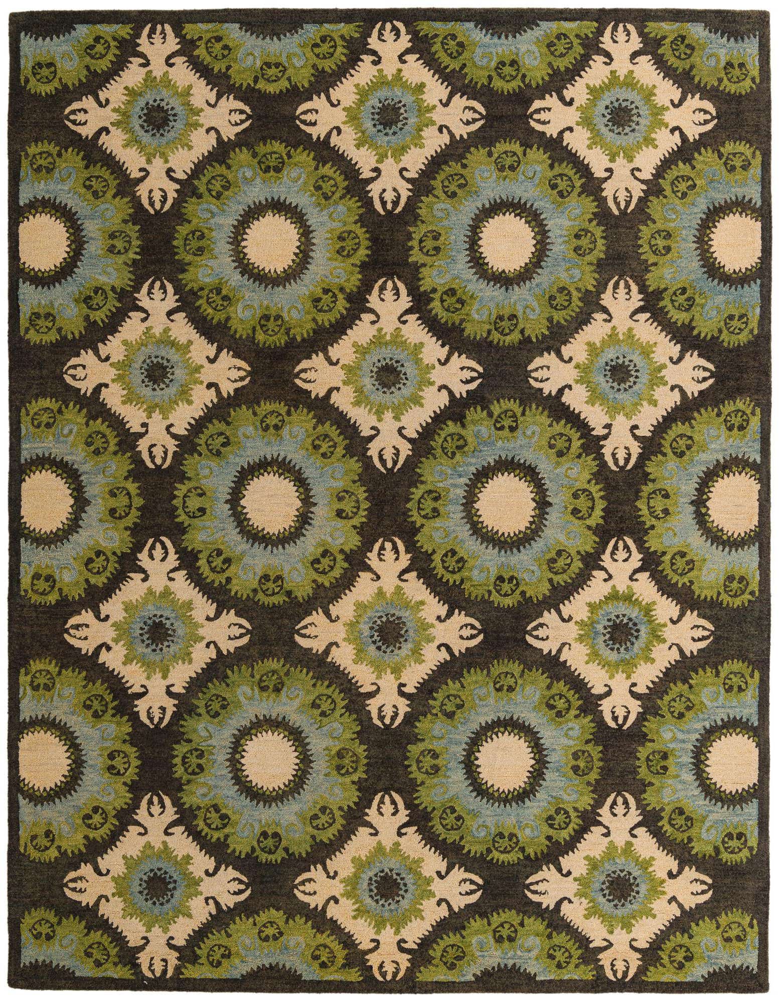 Primary color is Multi. Colors in this rug include: Multi, Black, Ivory, Light Blue, Light Green.