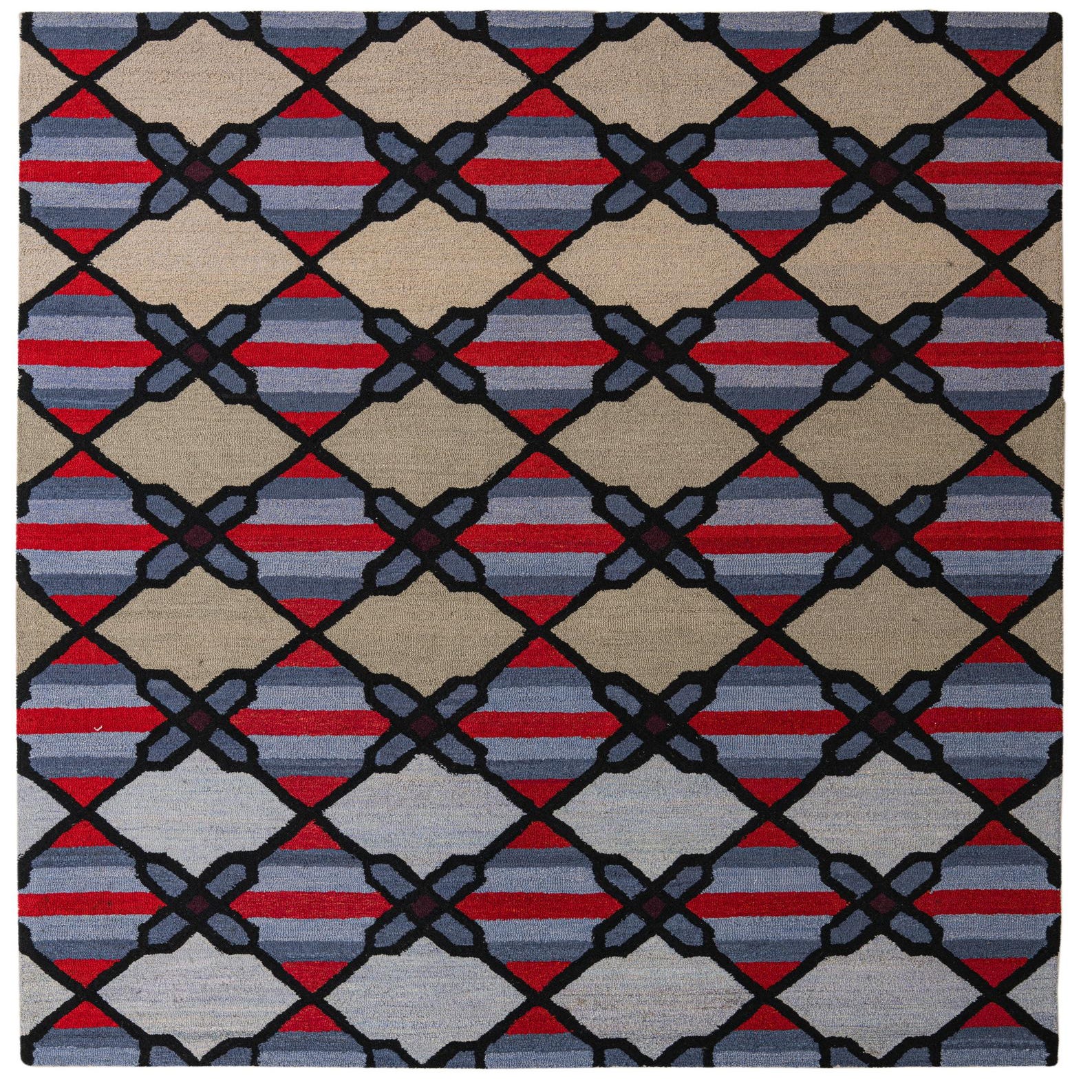 A rectangular 8x10 wool rug featuring a bold modern geometric pattern in multi-colored hues of red, blue, black, and beige.