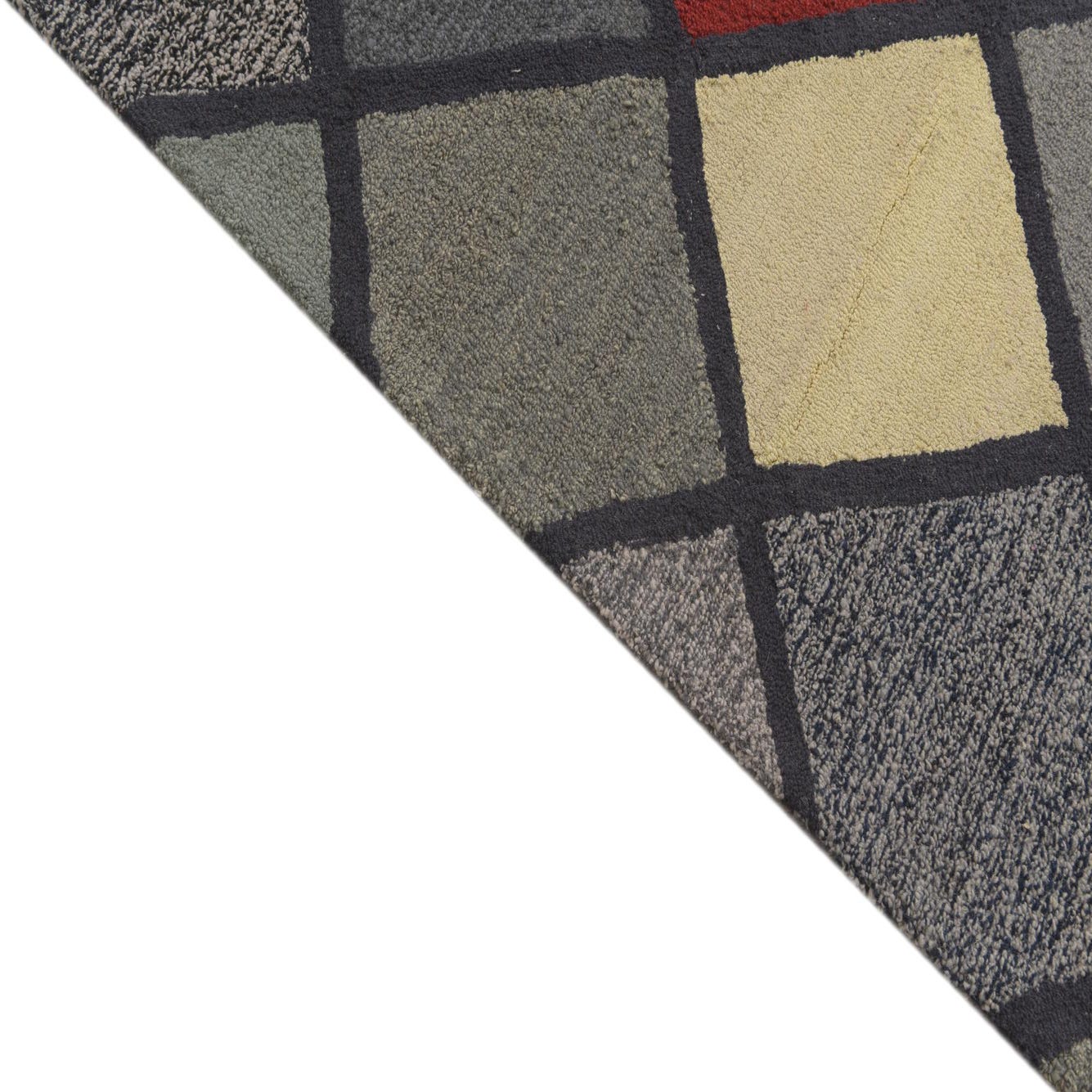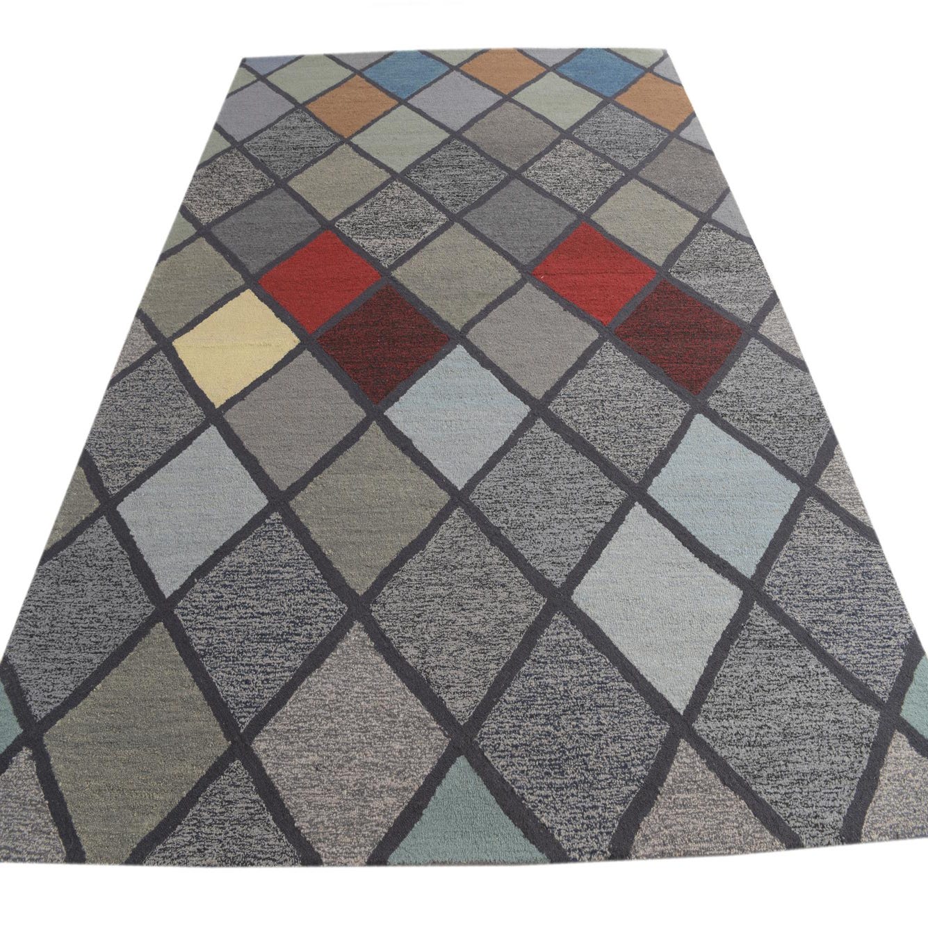 A rectangular 8x10 Luna rug featuring a modern argyle pattern with multi-colored wool diamonds in shades of blue, red, green, gray, and brown, outlined in dark gray.