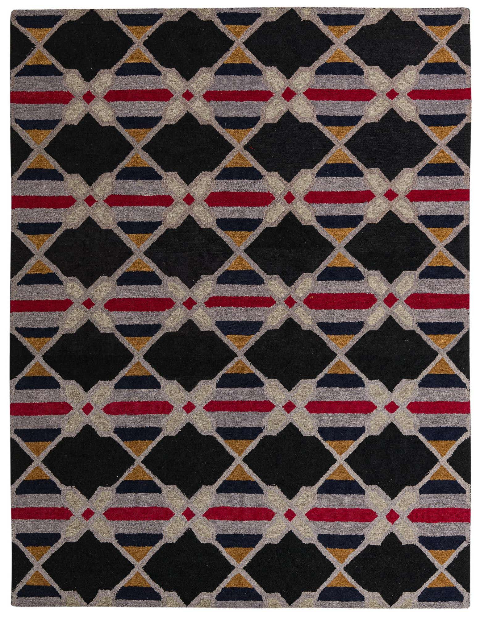 The Luna collection presents a hand-tufted rug crafted from 100% wool, boasting durability and a soft, plush texture. This 8x10 piece features a striking geometric pattern that interplays with a dynamic color palette including beige, black, gray, navy blue, red, and light blue on a multi-colored background. The crisp lines and blocks of color create a bold statement that can anchor a room with its contemporary flair.