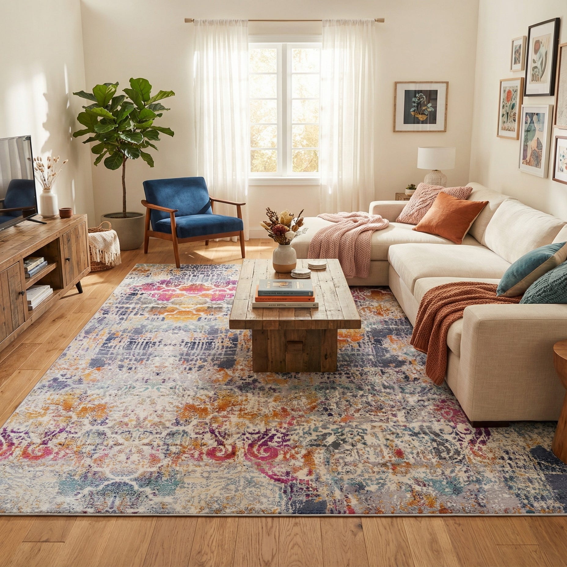 A layered, distressed pattern blends softened medallion motifs with painterly washes and grid-like texture, creating an artful, lived-in look. The multi background lets pops of turquoise, blue, gold, orange, purple and gray float across an ivory-washed field, so the design reads both vibrant and subtle depending on the light. The visual texture is intentionally broken and worn, with floral scrolls and abstract marks that overlap for a contemporary-meets-traditional effect.