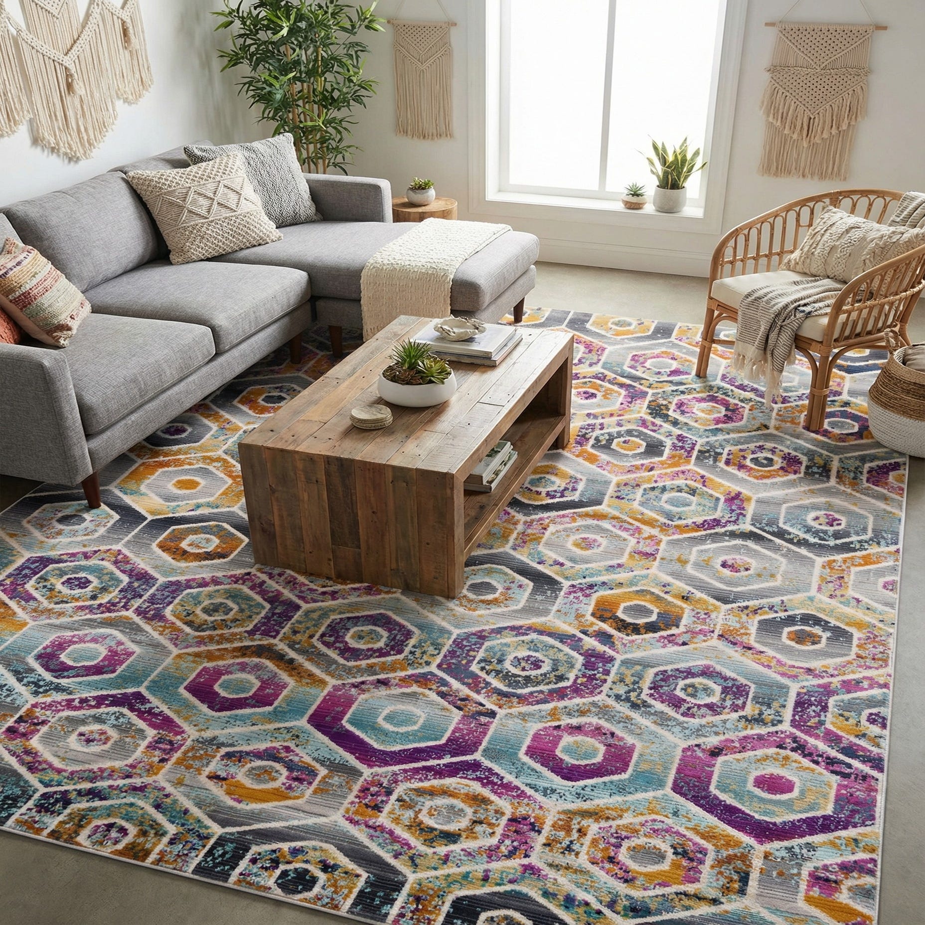 A bold geometric layout of interlocking hexagons defines this rug, each hexagon containing concentric rings and a small central disk. A painterly, distressed overlay and subtle horizontal striations add layered depth, while a vibrant palette—multi background with gold, ivory, light blue, orange, violet, yellow and pink accents—creates lively movement across the surface. The combination of crisp shapes and soft, speckled color gives the piece a contemporary-meets-vintage character that anchors a room without overpowering it.