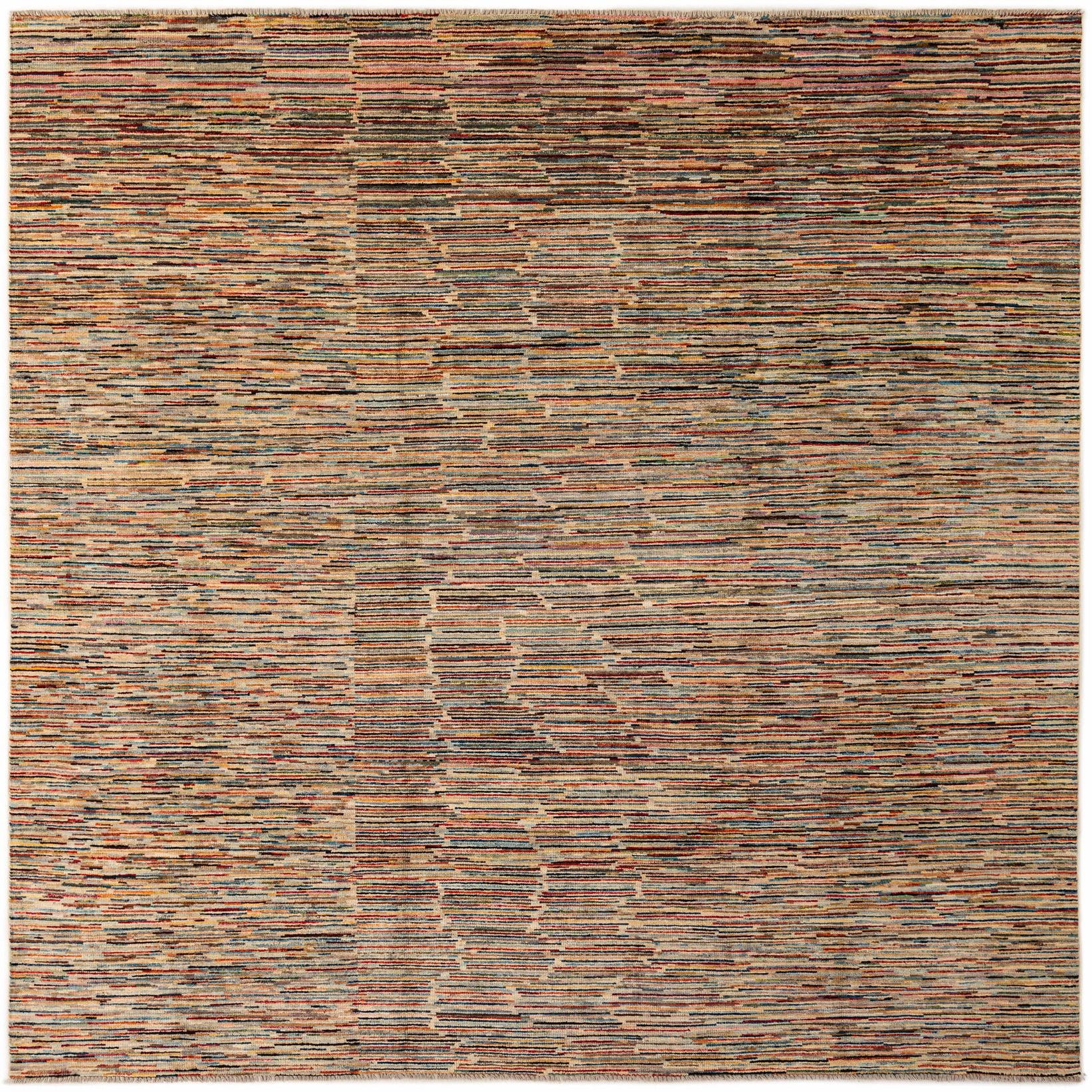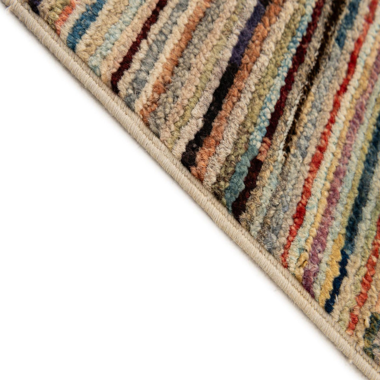 A rectangular 8x10 multi-colored wool rug with thin horizontal stripes and subtle geometric patterns, ideal for a living room.
