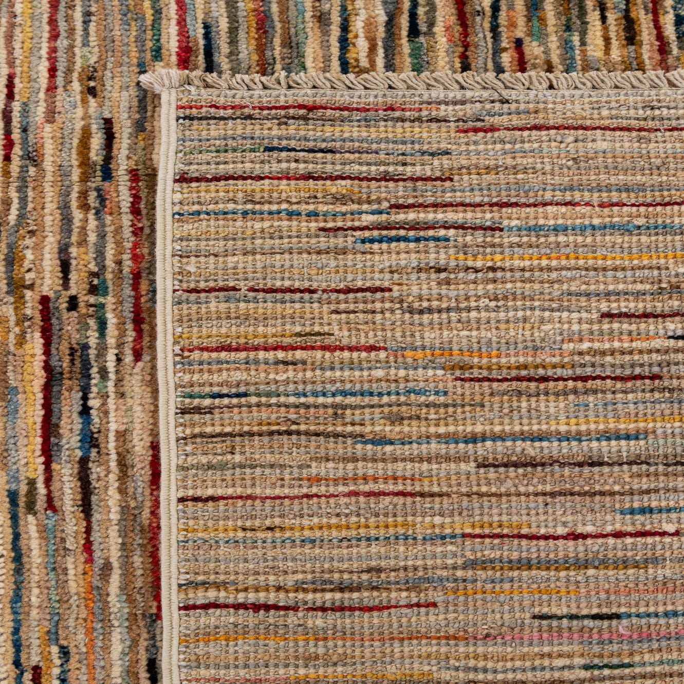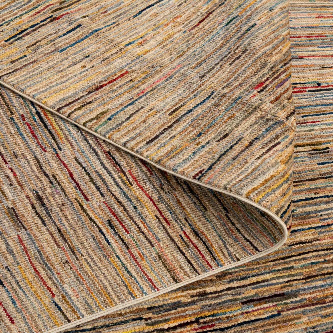 A rectangular 8x10 multi-colored wool rug with a modern stripe pattern, ideal for a living room.