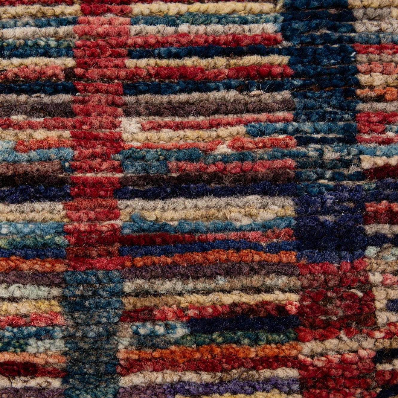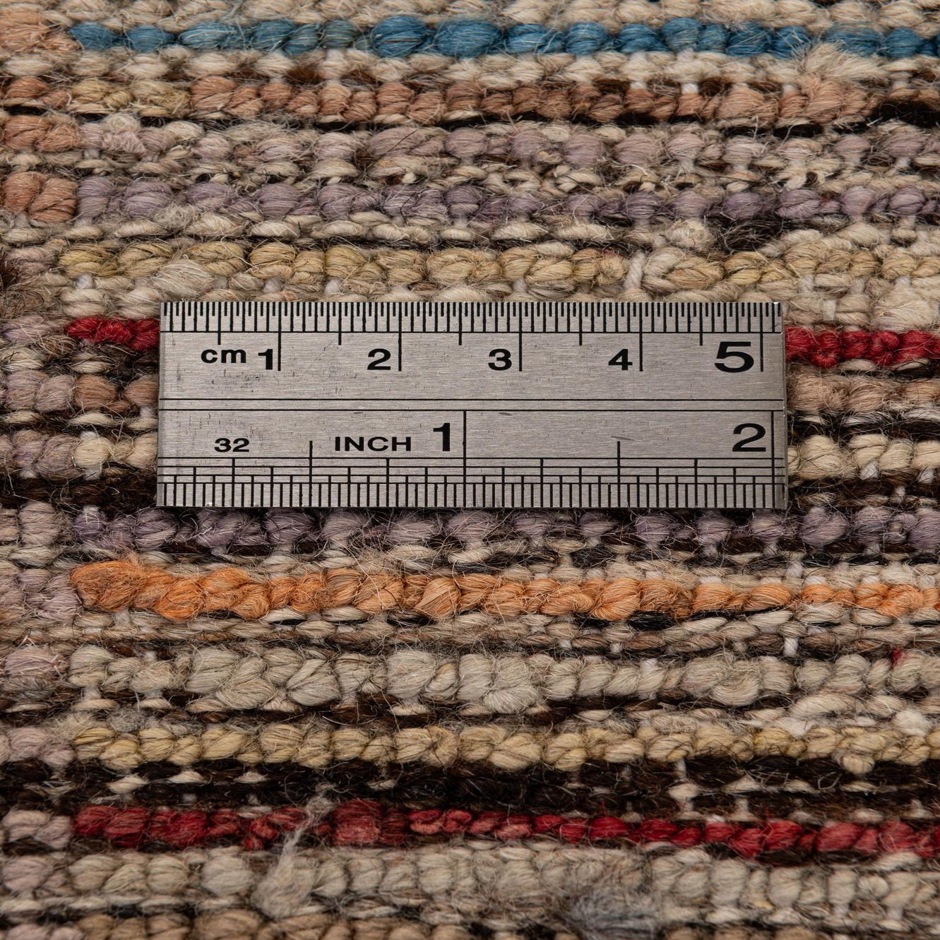 A tightly hand-knotted piece in 100% wool, this rug has a multi background punctuated by a dense field of short, multicolored stripes arranged in a subtle grid. Narrow vertical bands in beige and navy break the horizontal striations, creating a woven mosaic of color that includes beige, black, blue, brown, gray, green, red, yellow, purple, and navy blue. The pile has a low-to-medium height with a slightly uneven hand that gives the surface a tactile, lived-in feel—soft underfoot with visible knotting that adds depth and texture.