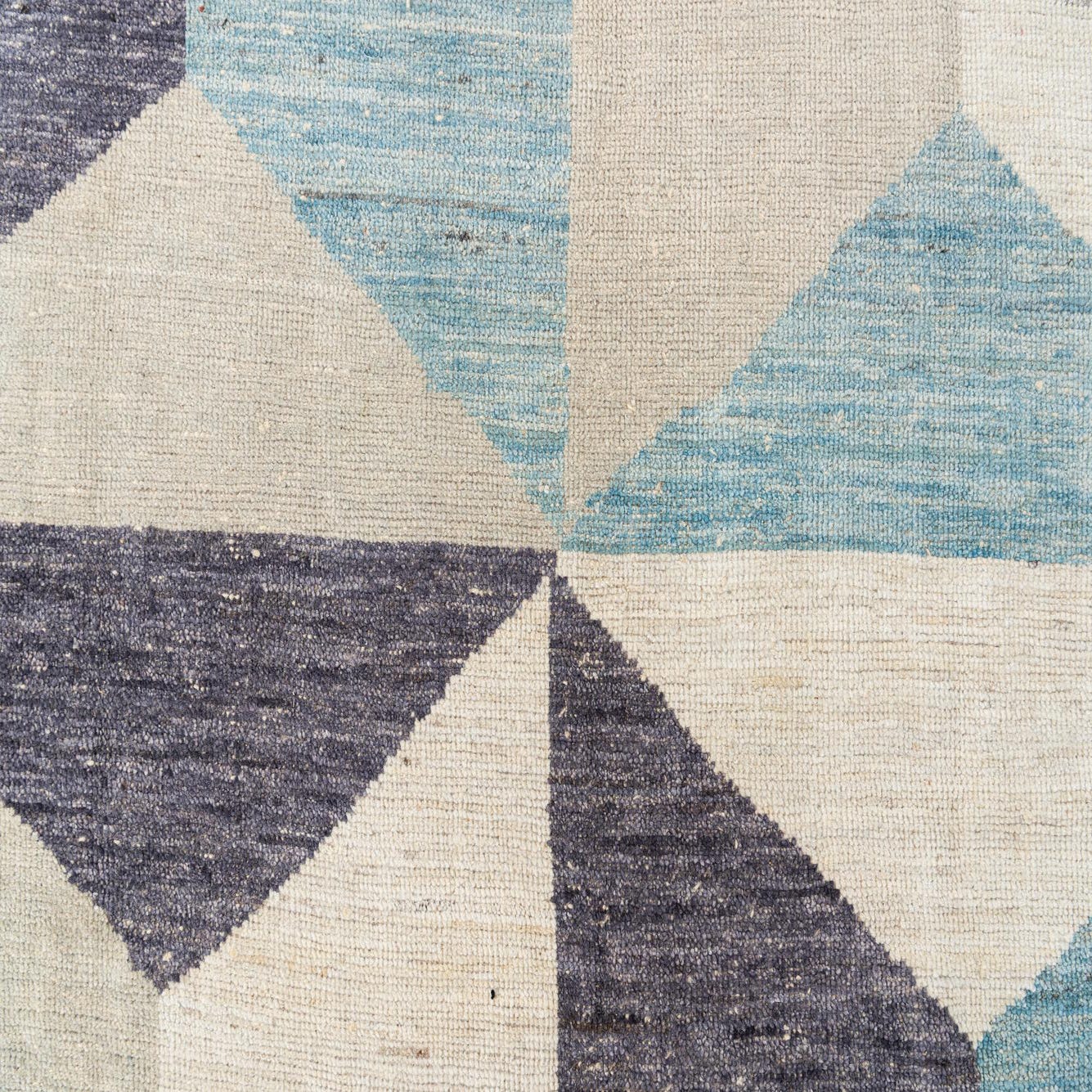 A rectangular 8x10 multi-colored wool rug featuring a modern tribal geometric pattern in shades of blue, purple, and cream.