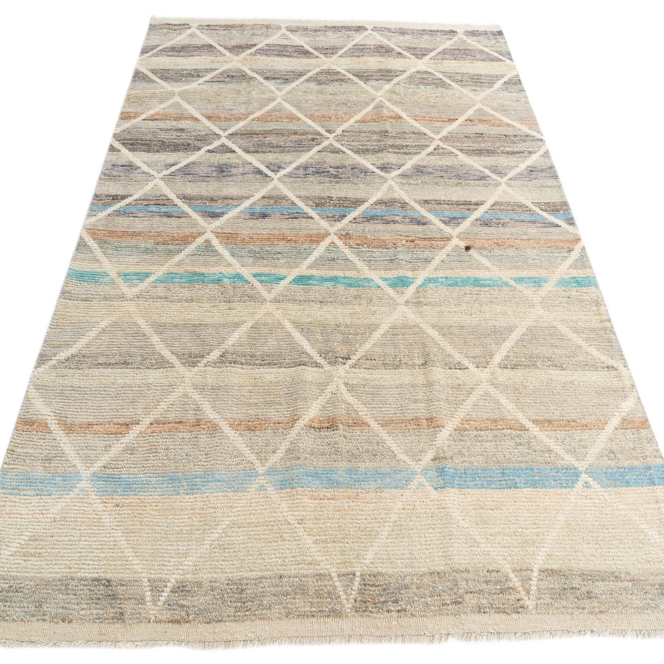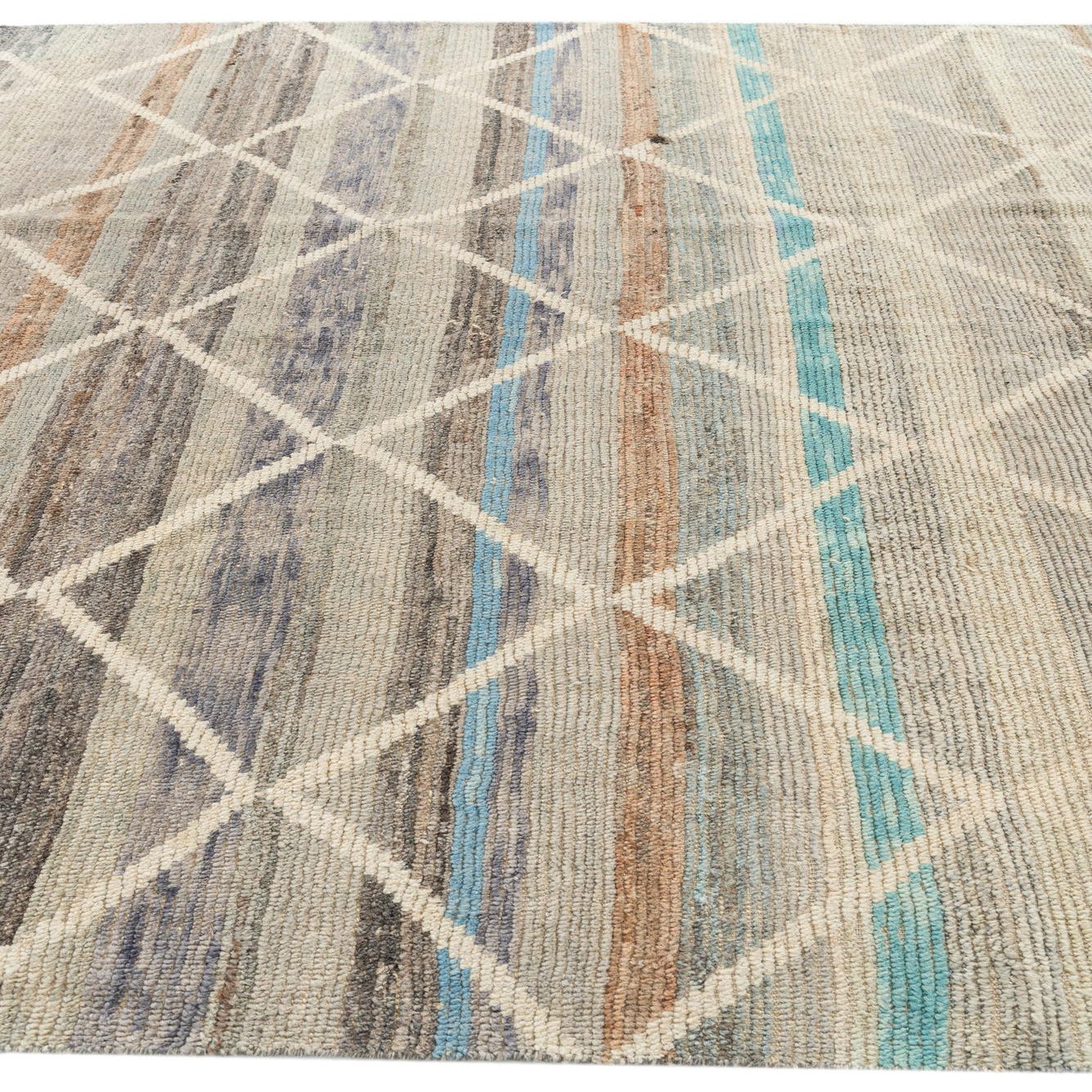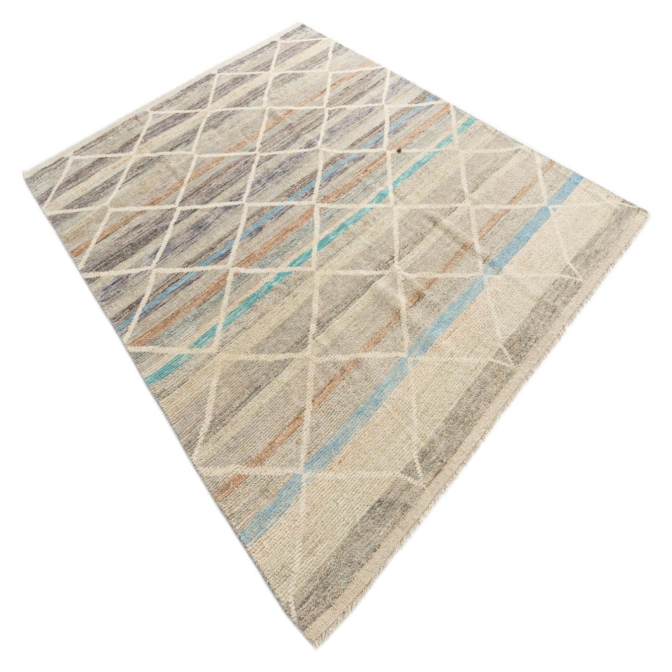 This Moroccan collection rug showcases a tasteful blend of earthy tones and a subtle geometric diamond pattern that offers depth and texture to any space. Hand-knotted from 100% wool, this 8x10 piece incorporates a diverse color palette including beige, blue, brown, gray, and light green set against a multi-colored background, providing versatility and a pleasing aesthetic. The texture is characteristically woolen, promising both durability and comfort underfoot.