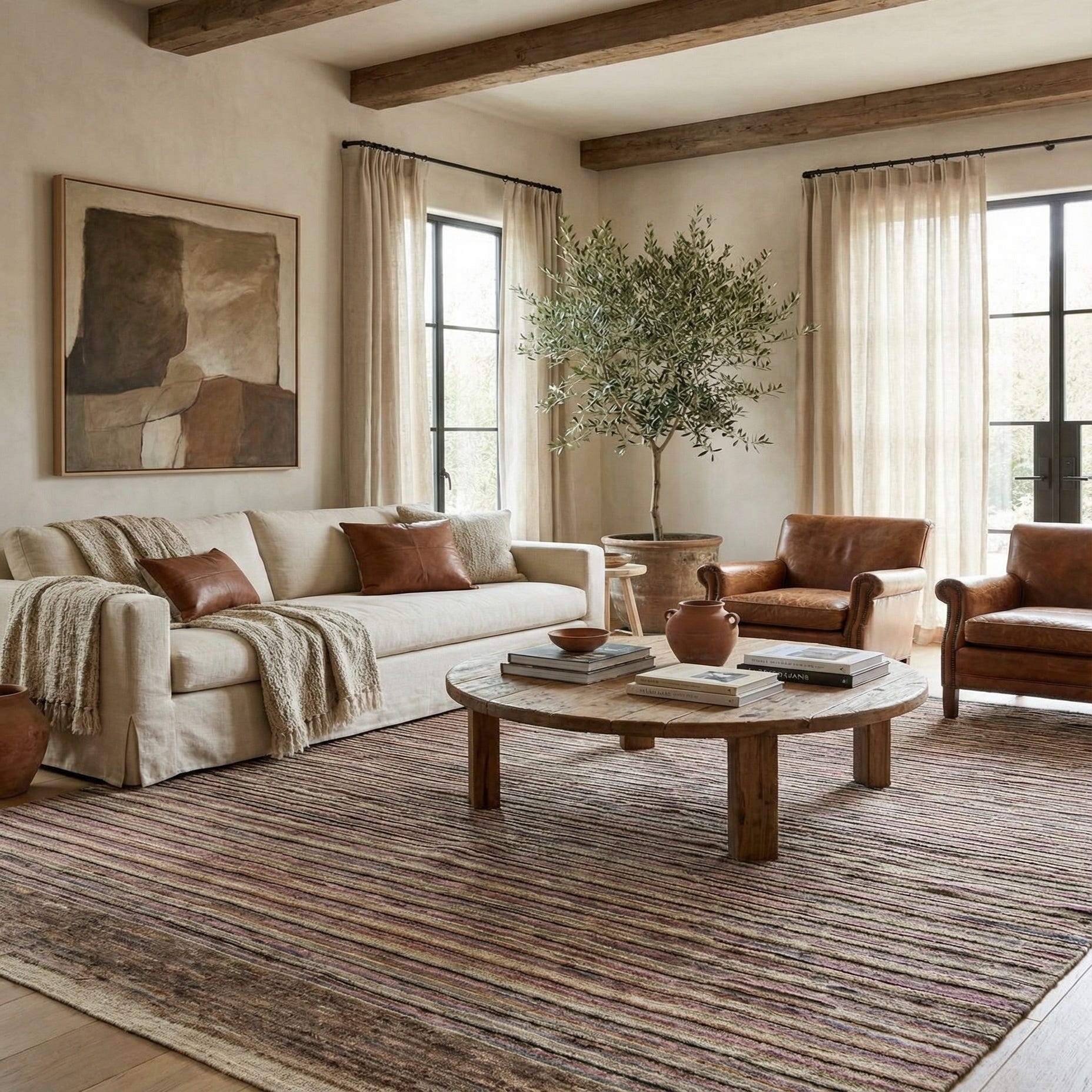 The rug's hand-knotted construction ensures a high level of durability and a plush feel underfoot. The subtle yet pronounced color variations within the lines offer versatility in styling, making the rug amenable to a wide range of interior decor themes. With its multi-tonal background, this rug can become a harmonious element in a neutral-toned setting or a grounding force in a more vibrant, eclectic space.