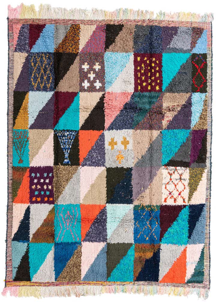 From the Moroccan collection, this 8x10 hand-knotted rug is a testament to craftsmanship and a vibrant addition to any space. The rug features an intricate pattern with a collage of geometric shapes and symbolic motifs, rendered in a rich palette that includes beige, black, blue, brown, burgundy, gold, gray, green, light blue, light brown, light green, light salmon, olive, orange, purple, turquoise, violet, pink, and ivory. With multi-color as its background, the variety of hues allows for versatile styling options.