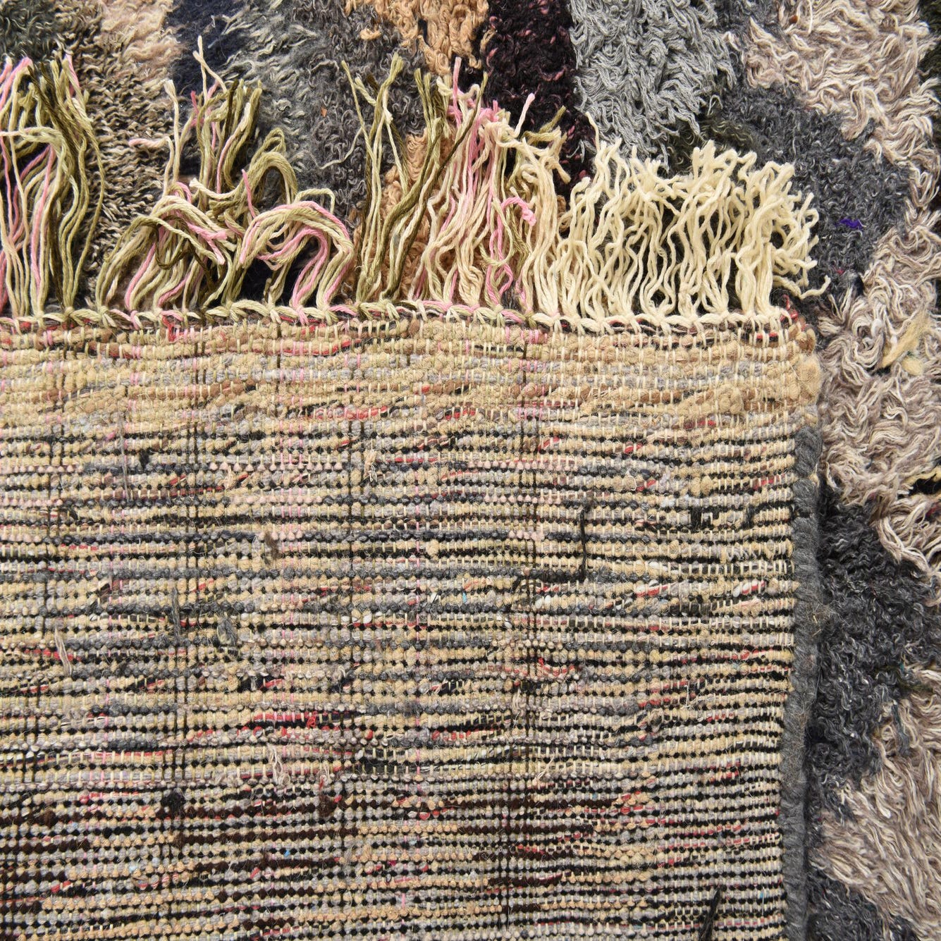This Moroccan collection rug is an 8x10 hand-knotted piece, artfully crafted from 100% wool. The rug showcases a vibrant multi-colored background, accented with hues such as beige, black, blue, brown, gold, gray, green, light blue, light brown, light green, light salmon, purple, red, pink, and ivory. The dynamic diamond pattern that adorns the rug adds a touch of tribal allure to the design, while the inclusion of fringe on the edges gives it an authentic, traditional feel.