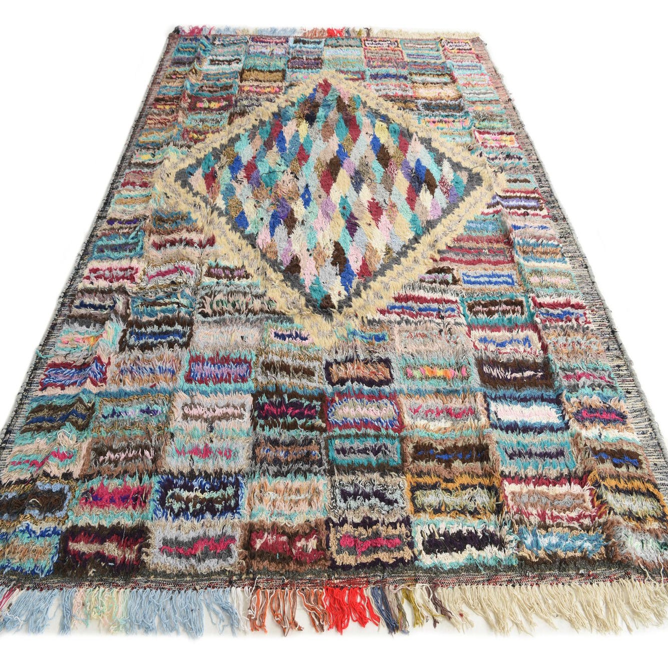 A vibrant 8x10 multi-colored Moroccan shag rug with a diamond medallion, featuring various shades of blue, red, green, and brown.