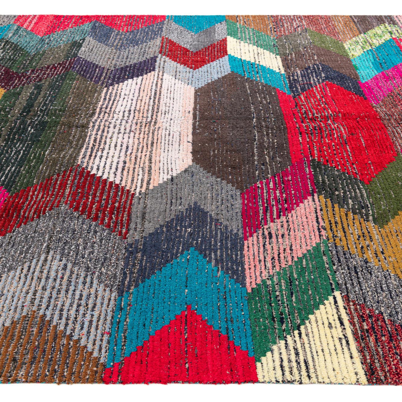 A vibrant 8x10 rectangular shag rug with a multi-colored tribal geometric pattern, featuring hues of red, blue, yellow, and green.