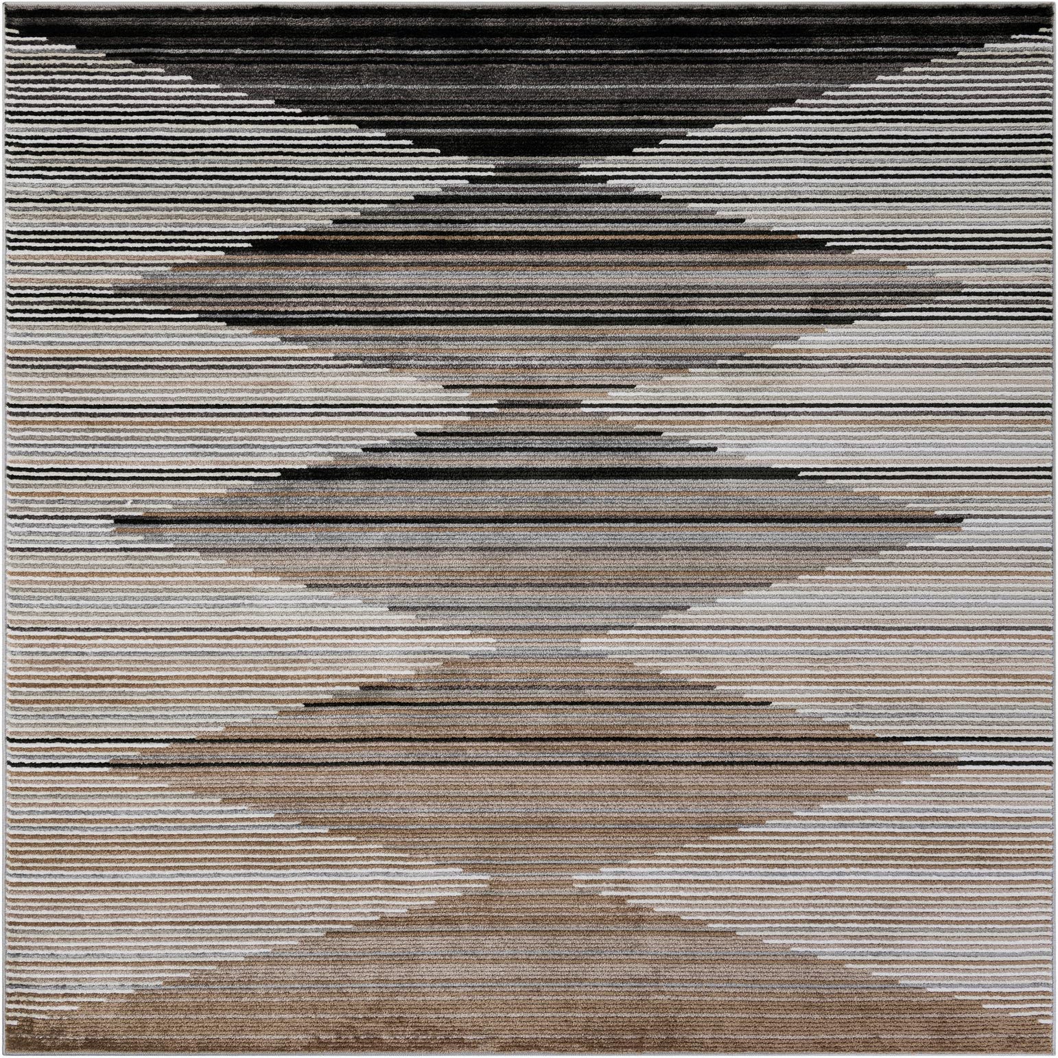 A rectangular 8x10 modern rug with a multi-colored striped geometric pattern in shades of black, grey, white, and brown.
