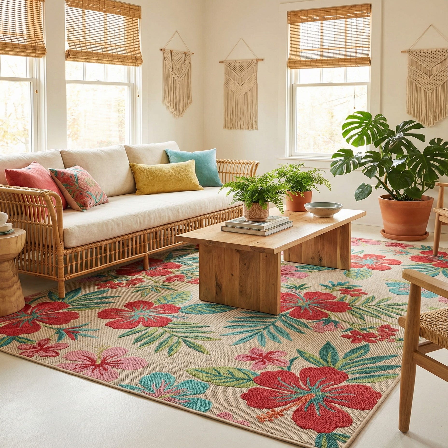 A vibrant 8x10 rectangular rug featuring a modern floral pattern with red, pink, and teal flowers, green leaves, and yellow accents on a light background.