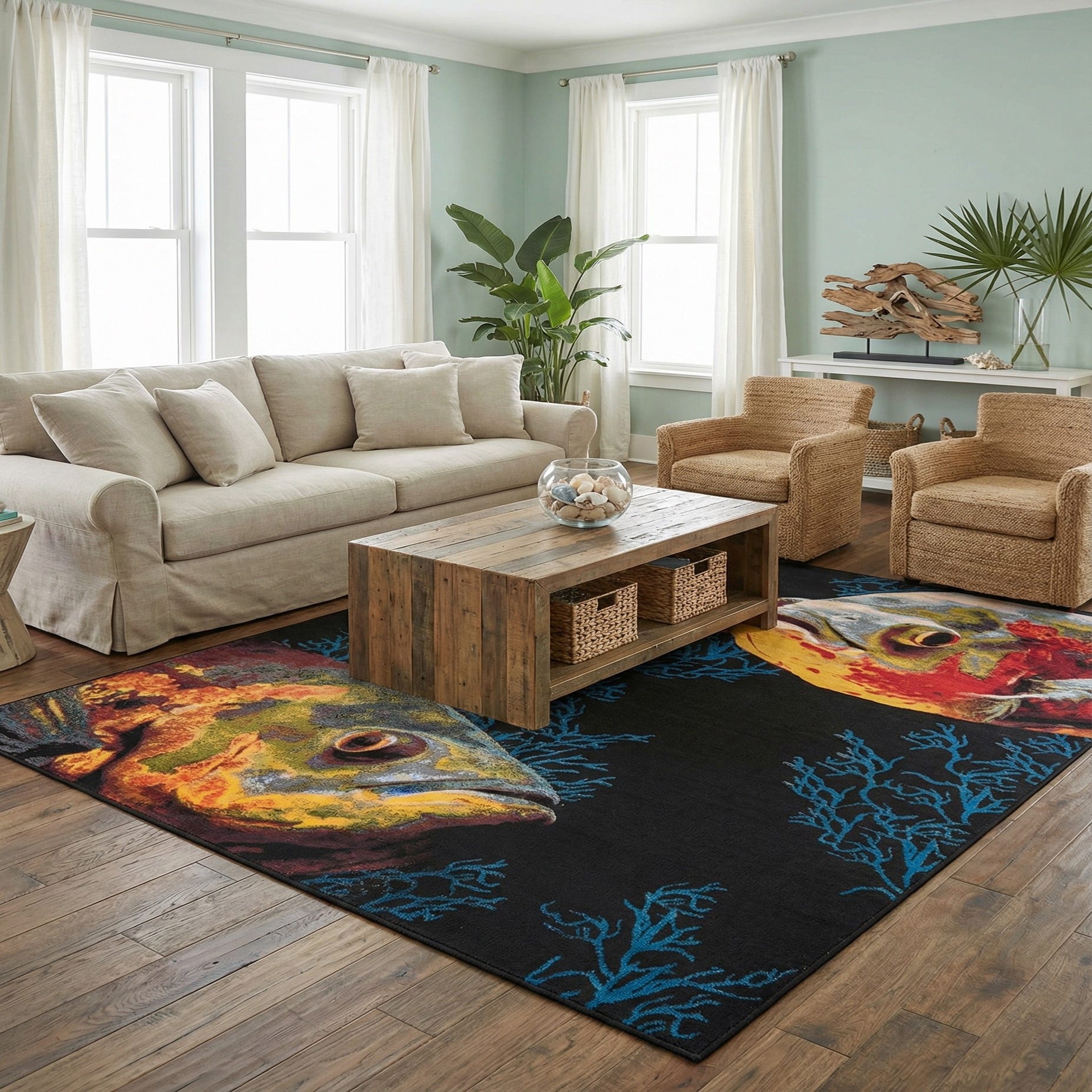 An 8x10 rectangular rug featuring two large, colorful fish with blue coral accents on a black background, suitable for indoor or outdoor use.