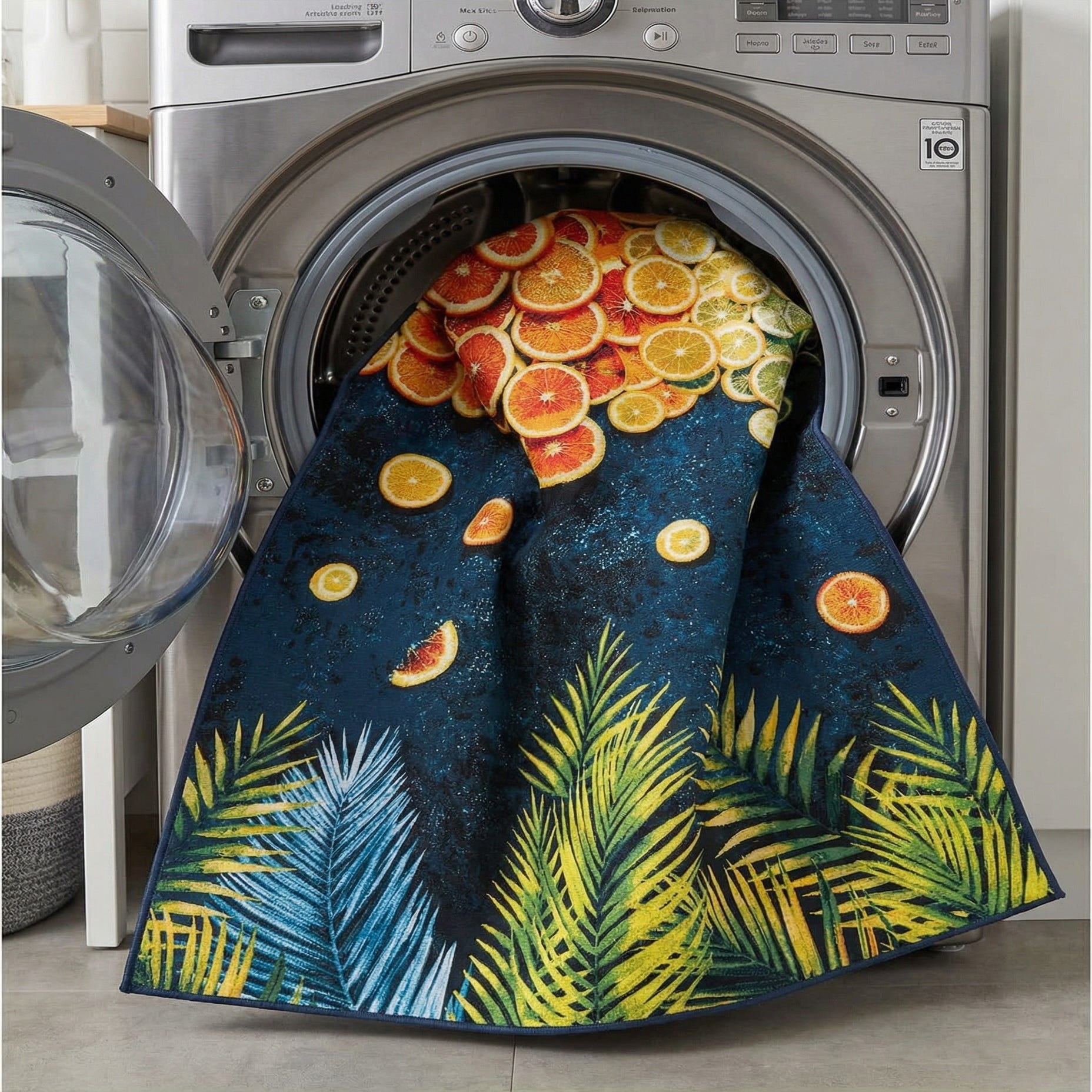 A lively coastal motif blends tropical palm fronds with a piled arrangement of citrus slices across a multi-toned field. Deep navy and black speckling forms the background while palm leaves in green, olive and cool blue arch from the top, and layers of lime, lemon, orange and grapefruit—accented with red and ivory—stack and float toward the bottom. Machine-made from 100% polypropylene, the surface has a low, dense weave that feels smooth underfoot with a subtle texture that holds the printed detail and color saturation well.
