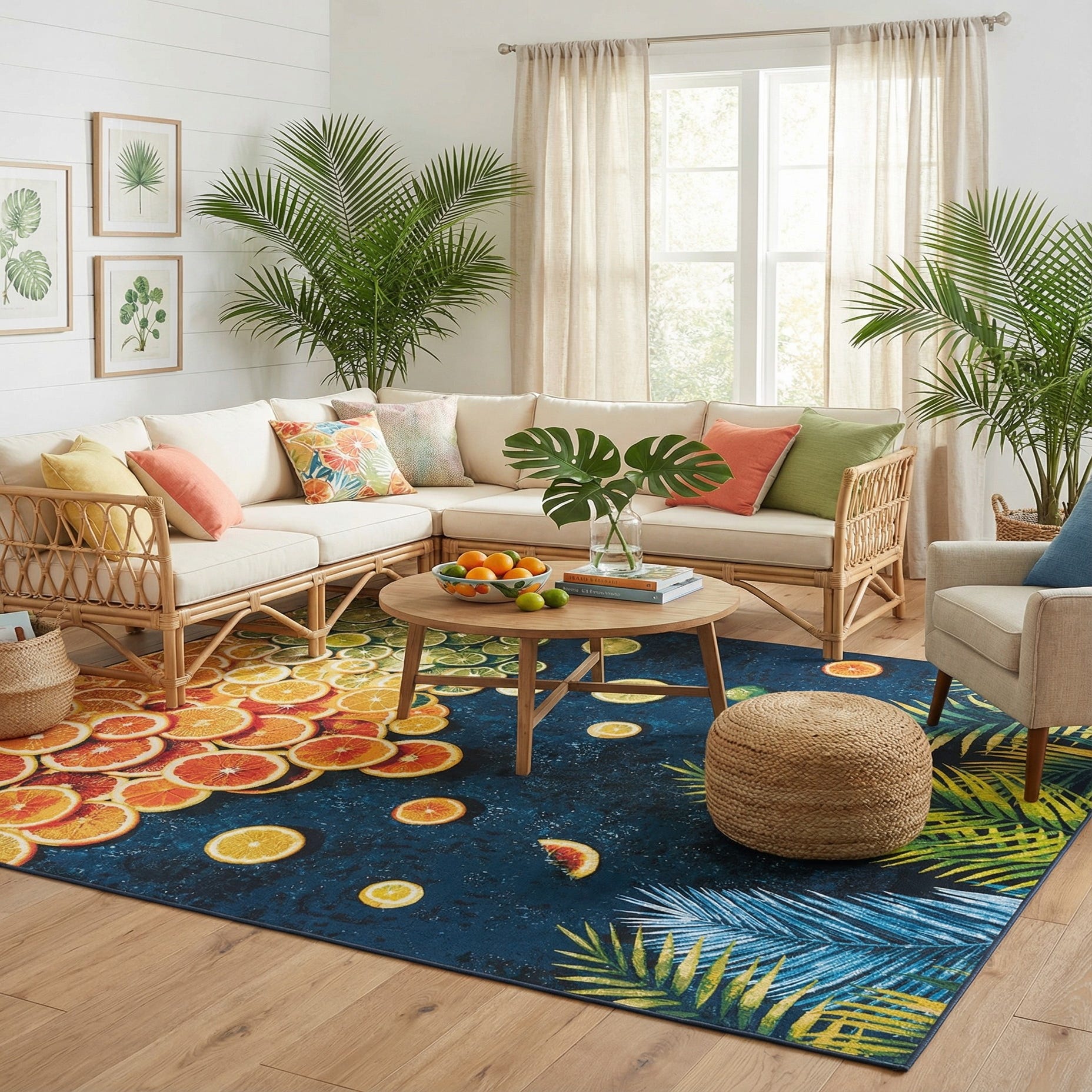 A vibrant 8x10 rectangular rug featuring a modern abstract design with green palm fronds and a colorful array of sliced citrus fruits (limes, lemons, oranges) against a dark blue background, suitable for indoor or outdoor use.