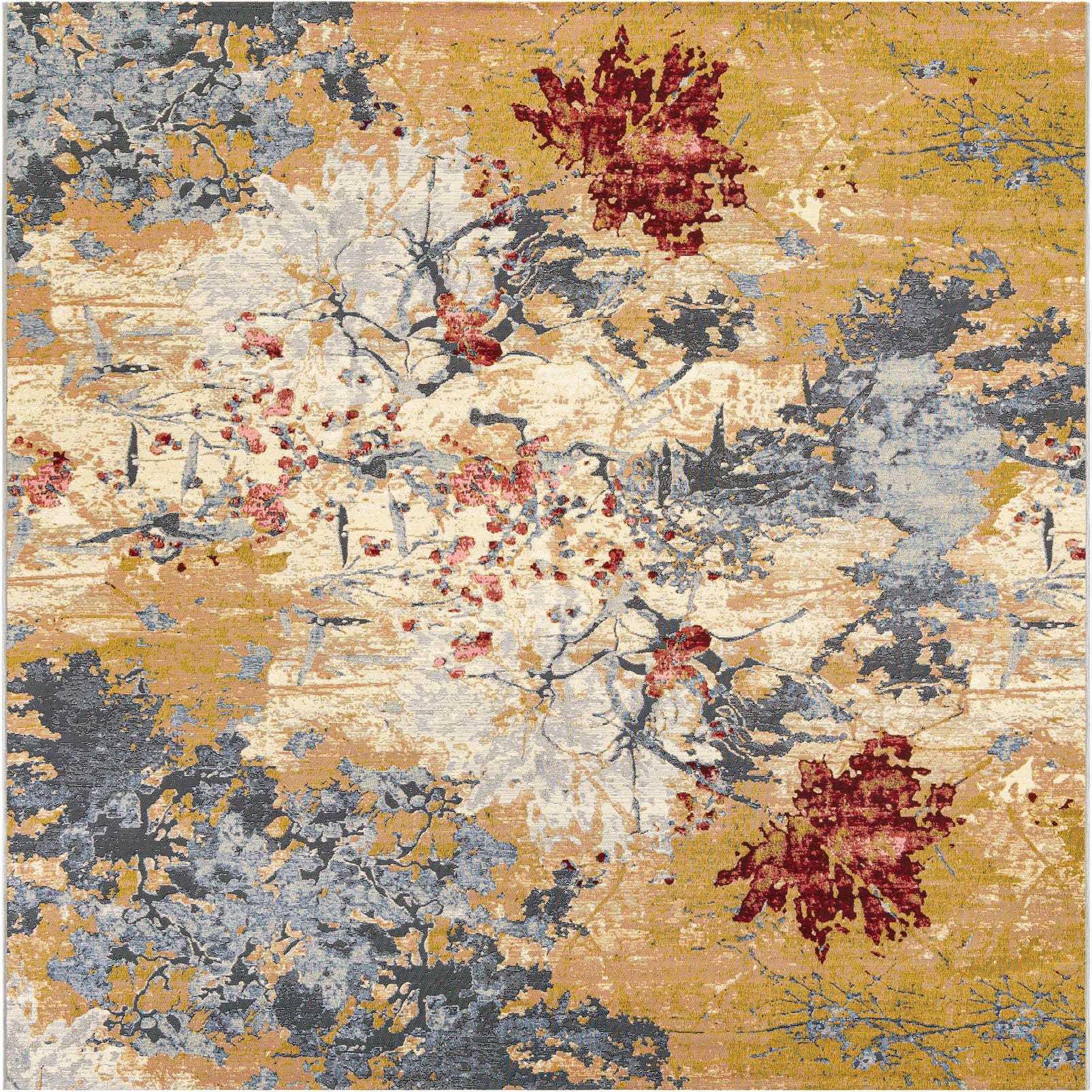 A painterly, modern floral with a multi-colored background, this rug pairs soft, layered washes of beige, gold and ivory with cool gray branches and rich burgundy blooms. The pattern blends abstract splashes and delicate botanical silhouettes for an artful, contemporary look that reads like a worn canvas. Machine-made from 100% polypropylene, the low, even pile has a slightly firm hand that keeps the printed details crisp while offering a smooth underfoot feel.