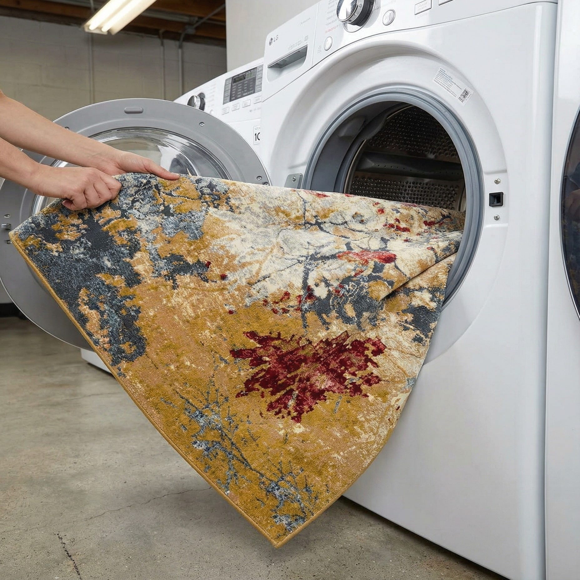A painterly, modern floral with a multi-colored background, this rug pairs soft, layered washes of beige, gold and ivory with cool gray branches and rich burgundy blooms. The pattern blends abstract splashes and delicate botanical silhouettes for an artful, contemporary look that reads like a worn canvas. Machine-made from 100% polypropylene, the low, even pile has a slightly firm hand that keeps the printed details crisp while offering a smooth underfoot feel.