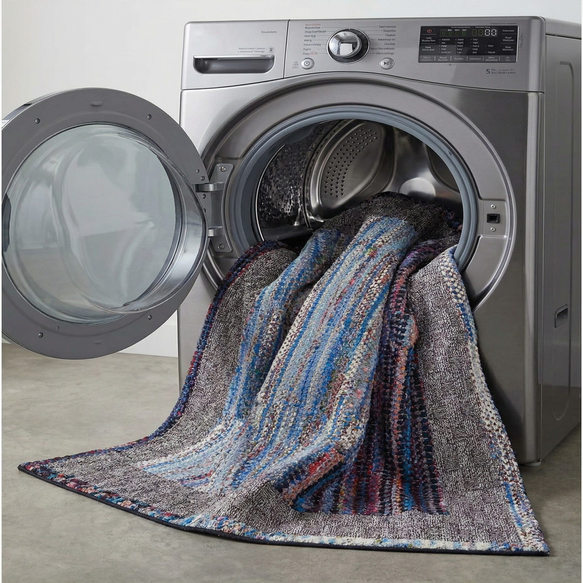 The colorway and pattern work well where bold color and tactile interest are needed—try it on a covered patio to bring an interior look outdoors, under a cocktail table to ground a mixed-material seating group, or in an entryway to introduce layered color at first sight. Pair with dark wood or leather furnishings to emphasize the deeper tones, or let the lighter blues and multicolored flecks liven a neutral, coastal, or bohemian-inspired interior.
