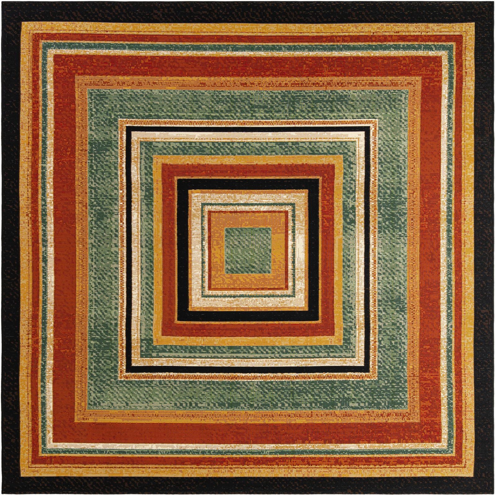 A rectangular 8x10 multi-colored modern area rug with a concentric square pattern in shades of green, orange, yellow, black, and white.