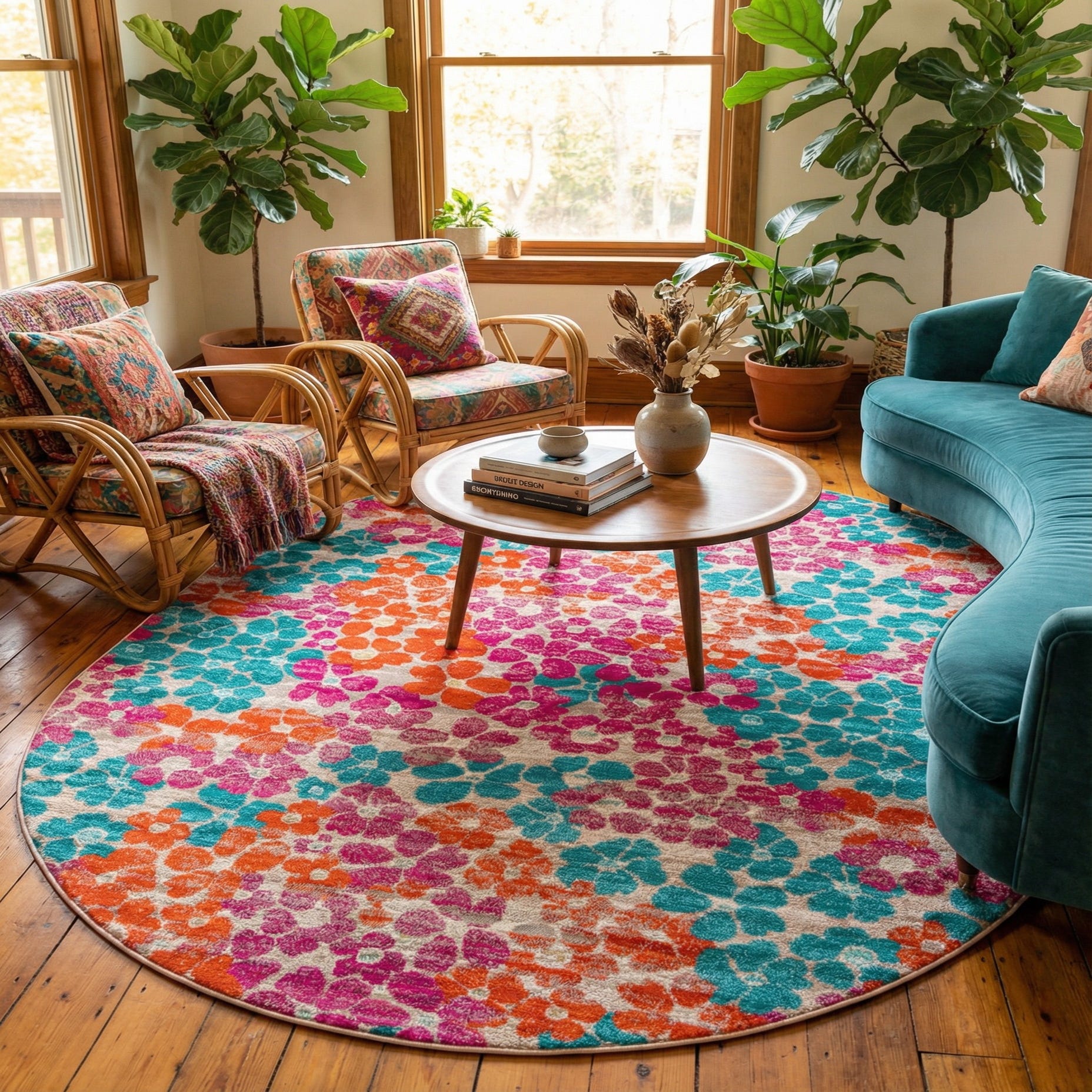 This piece suits a variety of relaxed interiors: place it beneath a small round dining table, in a breezy sunroom, or under a seating group to add color without overwhelming the space. It also works well in a child's room or play area where cheerful patterning and easy-care fibers are priorities. Pair it with natural wood tones or crisp white furniture and bring in accent pillows or art in turquoise, coral, or fuchsia to tie the palette together.