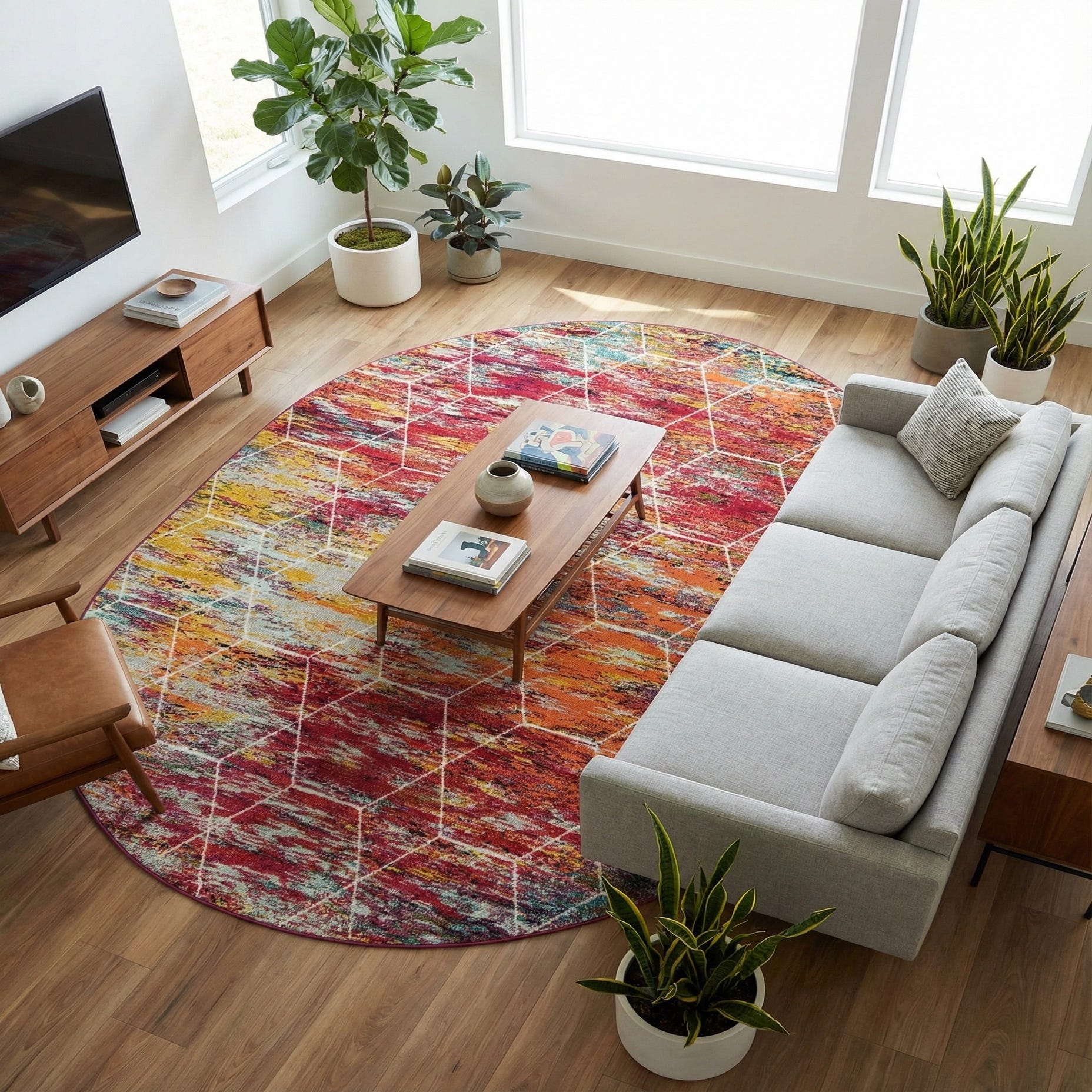 A lively, painterly field of color gives this oval rug a fresh, contemporary look. Bands of red, orange, yellow, pink, blue, green, purple, brown and black blend together across a multi-hued background, while a crisp, cream lattice of hexagons overlays the surface to add geometric structure. The contrast between the soft, striated color washes and the defined linear pattern keeps the design energetic but balanced, making it a strong focal point without overwhelming surrounding pieces.