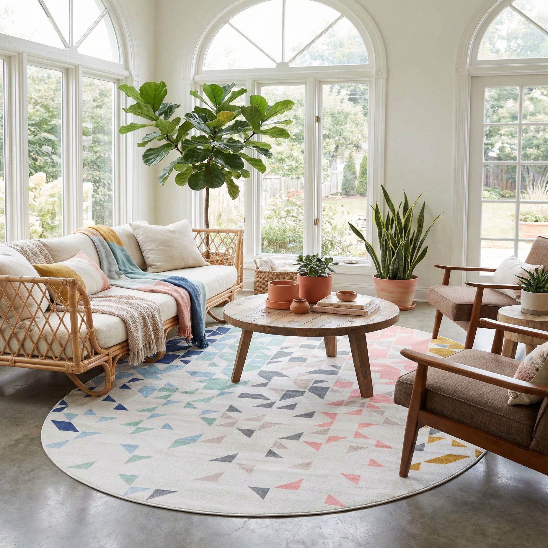 An 8' x 10' oval rug with a multi-colored abstract geometric pattern featuring triangles and squares in blue, green, grey, pink, and gold on a light background.