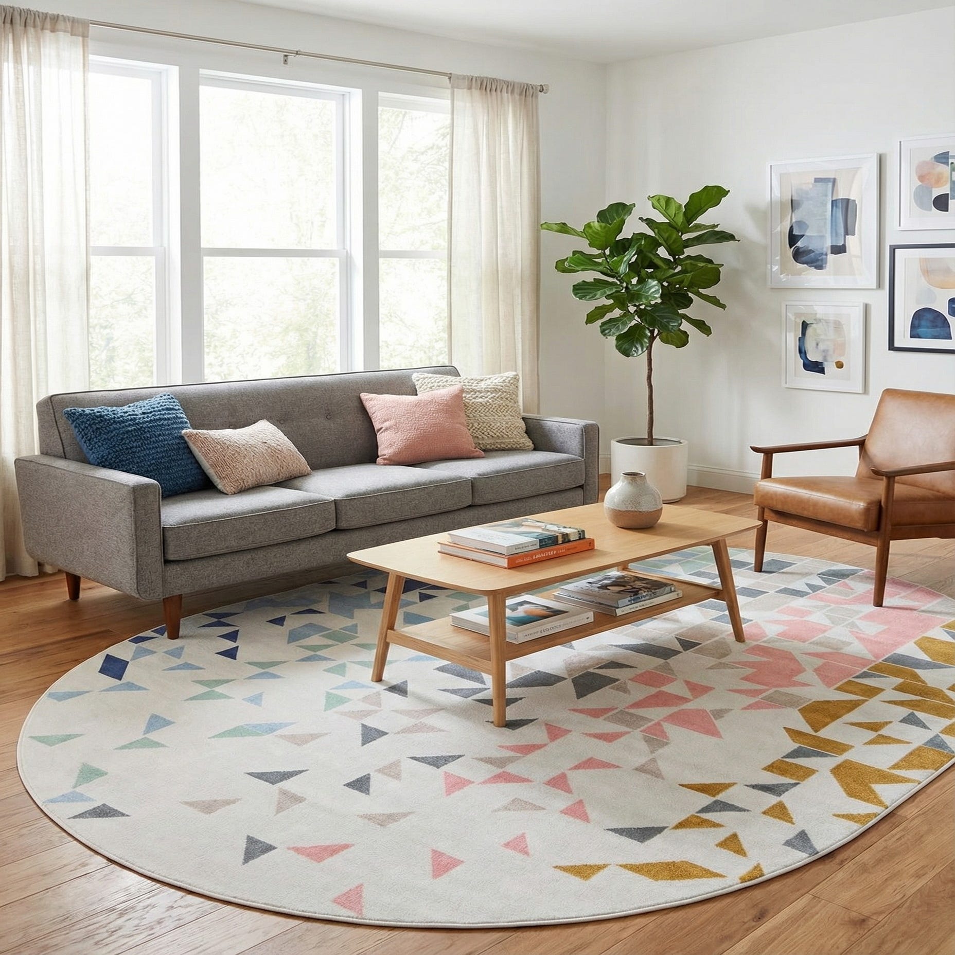 Machine-made from 100% polypropylene, this rug offers a refined look with practical performance and a stable construction that lays flat in everyday spaces. It pairs well with light-wood or painted furniture for a fresh, modern living room, beneath a round dining table or in an entry or breakfast nook where the oval shape complements curved furniture. The color mix also complements mid-century and Scandinavian palettes—use it to add quiet pattern to a neutral bedroom or to bring coordinated color into a playful nursery or casual family room.