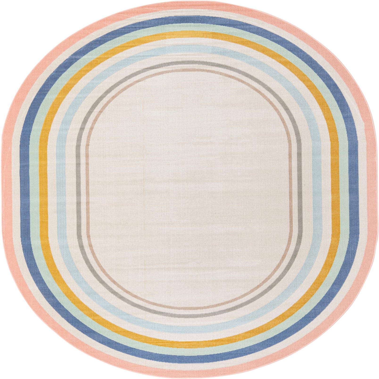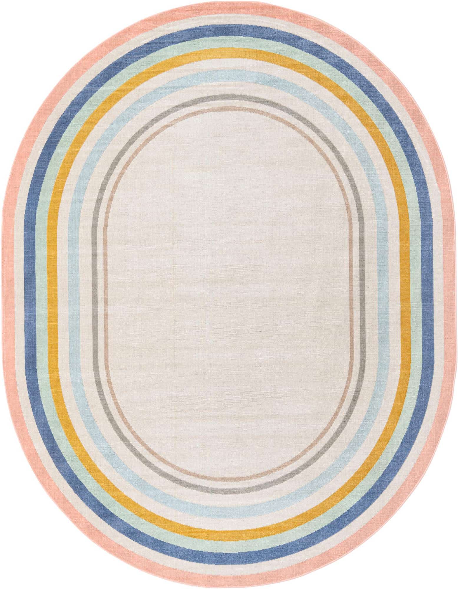 The rug's pattern features a series of concentric oval stripes that create a sense of movement and continuity, adding visual interest to any space. Its color palette boasts a multi-hued background with accents of blue, gold, gray, ivory, pink, light blue, and light brown — a versatile combination that can harmonize with a wide range of color schemes.