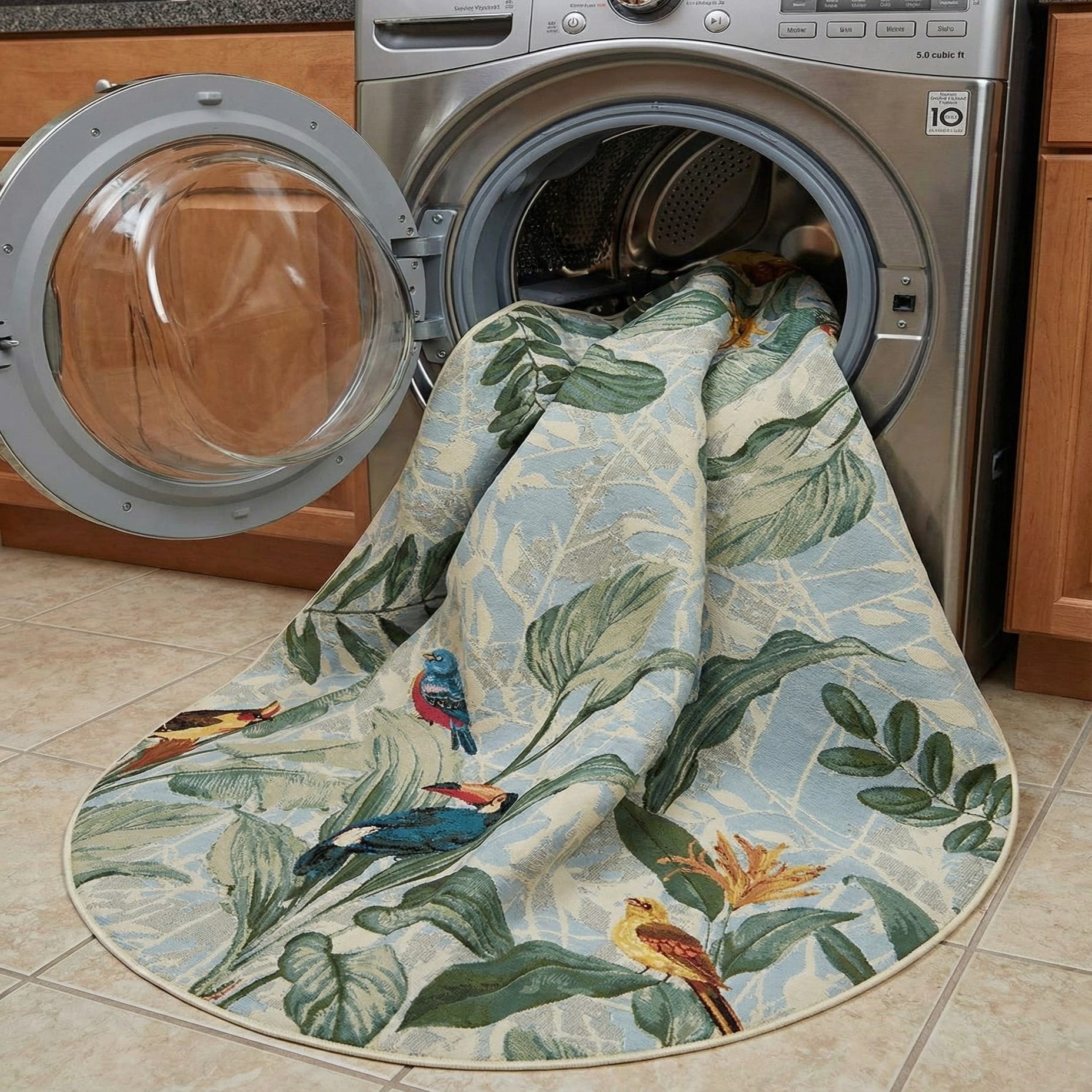 A 7'10 x 10'0 oval rug with a vibrant botanical pattern featuring tropical birds, green leaves, and yellow flowers on a light blue and beige background.