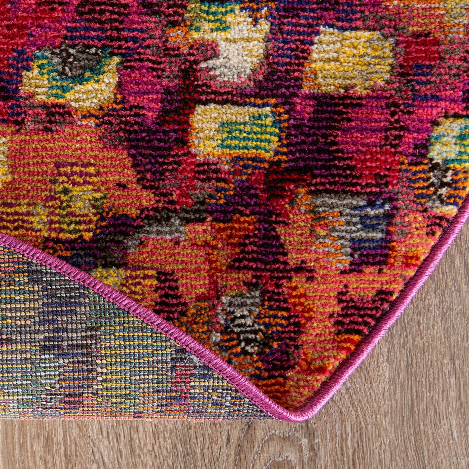 A vibrant, abstract mosaic pattern mixes small rectangular motifs with painterly washes set on a multi-colored background. Deep burgundy areas blend into warm gold and orange fields, while pops of cream, gray, green, light blue, navy blue, purple, violet and pink create lively contrast and layered depth. The overall look reads contemporary with a playful, artistic sensibility that complements modern, bohemian, or eclectic interiors.