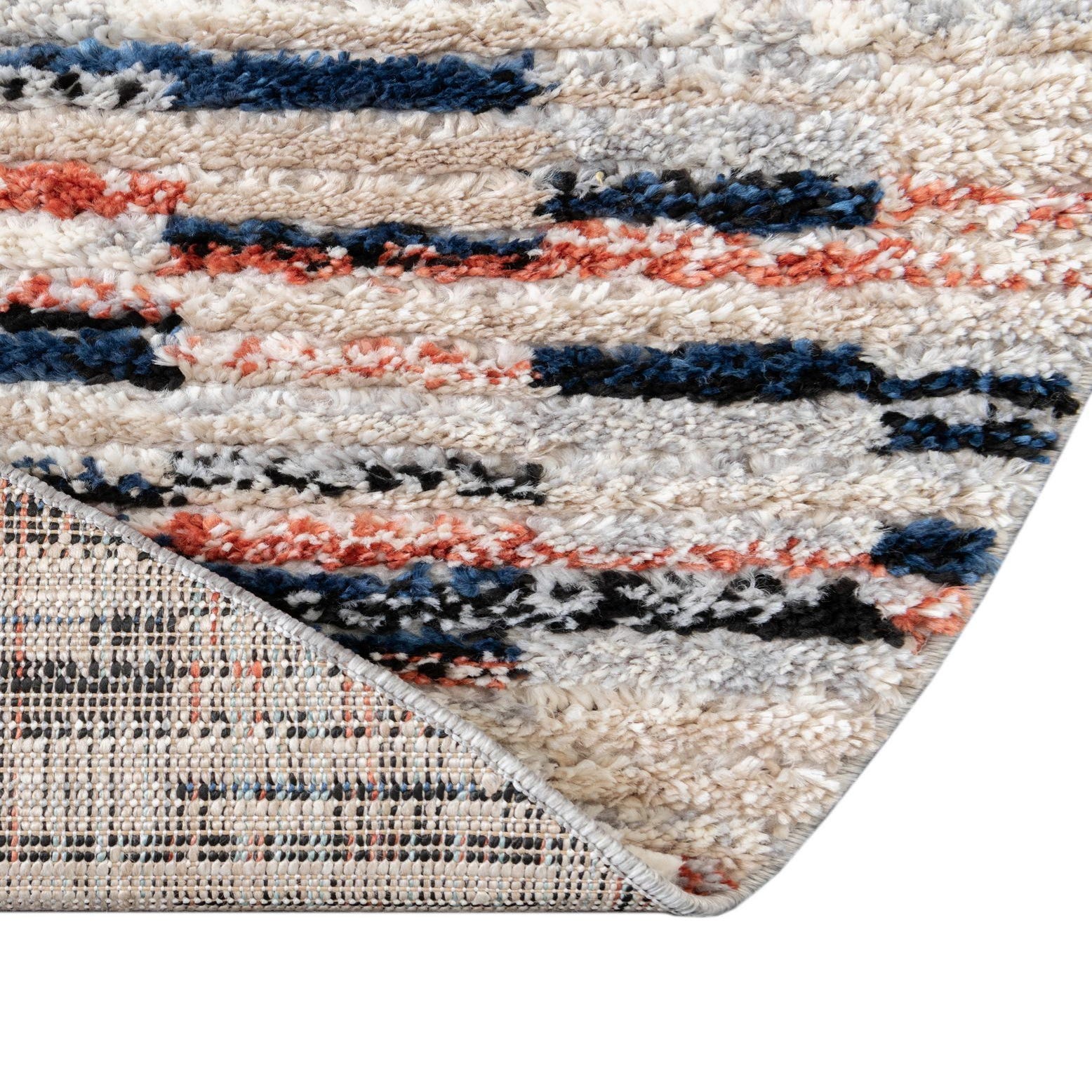 A modern, abstract linear pattern of short, irregular dashes layers navy blue, rust red, black and gray across a multi-tonal ground of beige and ivory. The scattered, striated motif creates visual movement without a defined border, giving the rug a contemporary, slightly weathered look. Machine made from 100% polyester, the pile feels soft and smooth underfoot with a low sheen that gently catches light and adds subtle depth to the surface.