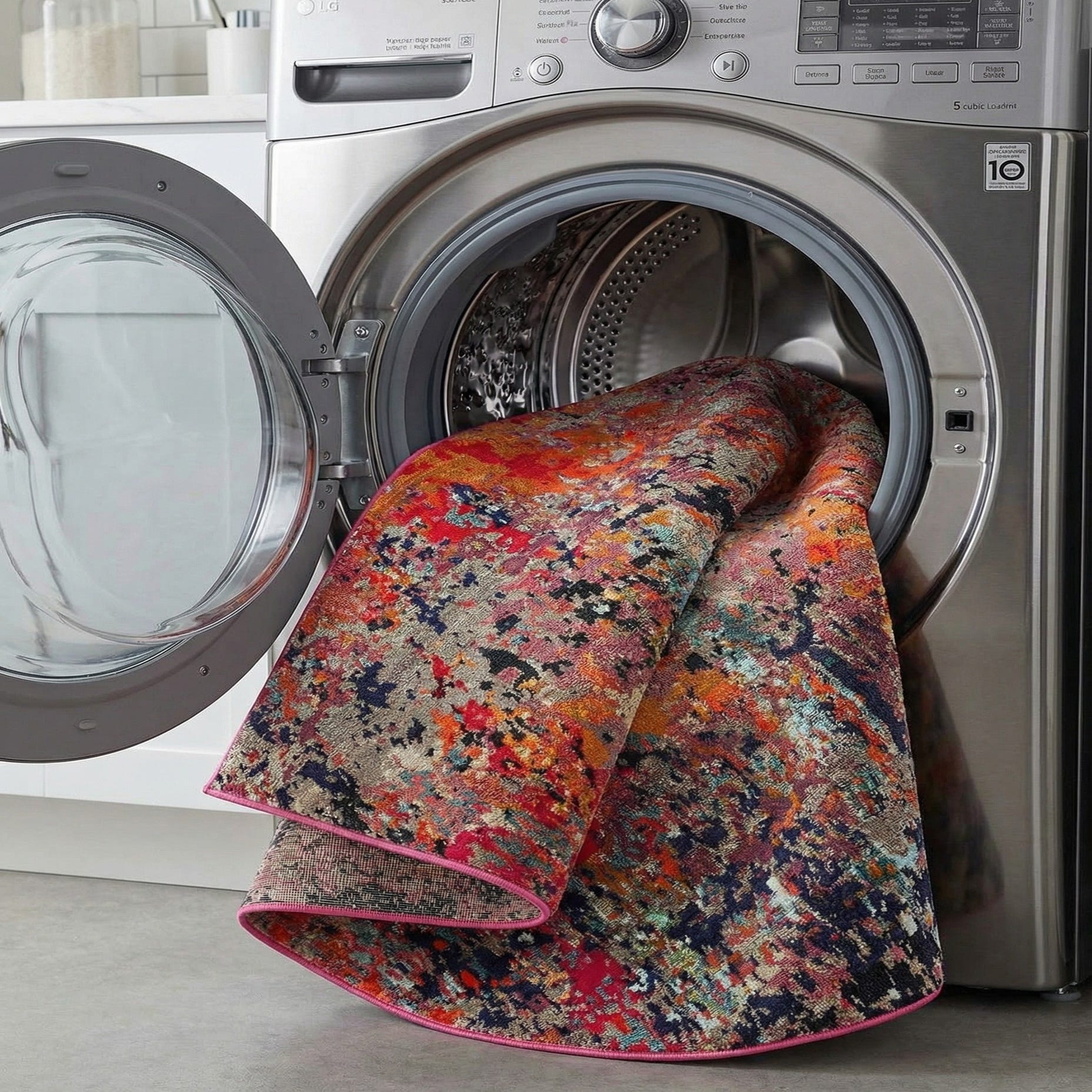 Machine made from 100% polypropylene, the rug has a low, tightly woven pile with a smooth hand that feels comfortable underfoot while maintaining pronounced color detail. This piece fits well in contemporary living rooms or eclectic seating areas where color is a focal point, and it can anchor conversational groupings or sit beneath round or oval dining tables. It also pairs nicely with neutral furnishings to let the colors pop, or with mid-century and bohemian decor where layered textures and bold hues create visual interest.
